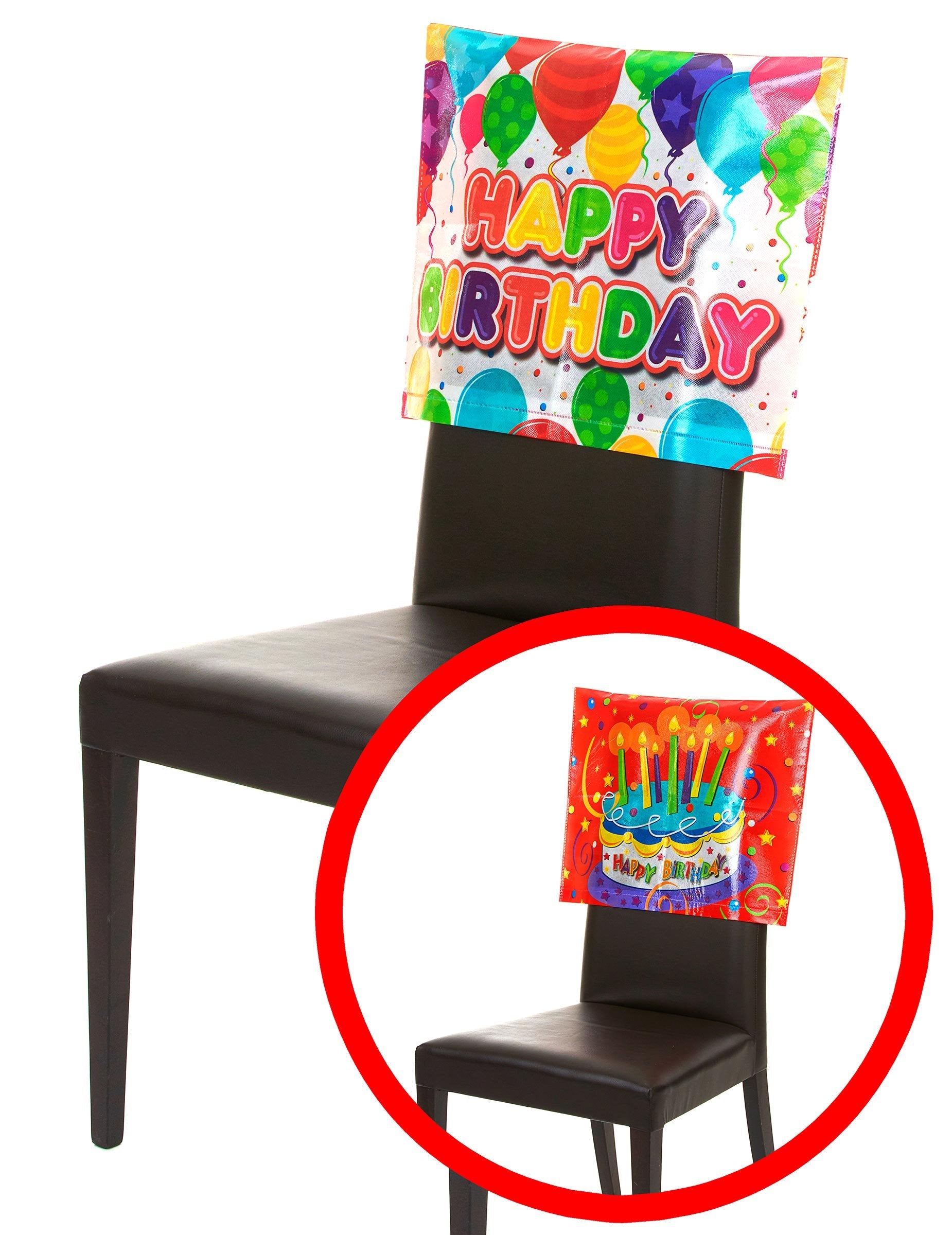 Această acoperire a scaunului vândută pe unitate este plastică groasă de 38 cm înălțime cu 48 cm lățime. Tipărit pe față și în spate, mențiunea „La mulți ani” pe fundal alb cu baloane multicolore este prezentă. Pe spate, un tort de naștere superb cu lumânări este reprezentat pe un fundal roșu. Dimensiunile sale vor face o copertă adaptabilă pe majoritatea scaunelor. Va fi ideal pentru decorarea scaunului „regelui” sau „reginei” zilei, sau chiar pentru toți oaspeții. O decorare colorată pentru o petrecere sub semnul unui bun umor!