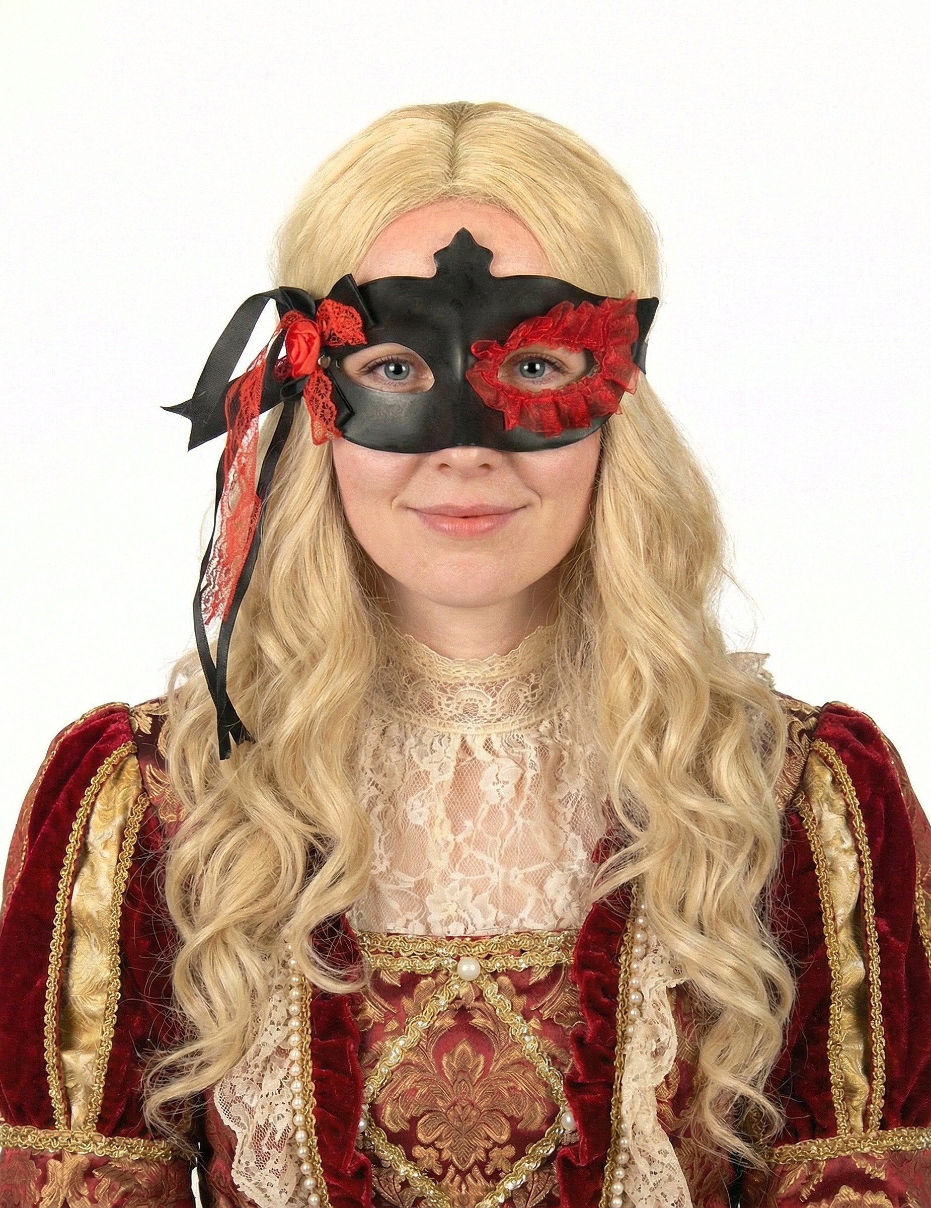 Acest lup negru pentru femei are dantelă roșie în jurul ochiului stâng, precum și un nod din dantelă roșie și neagră, lângă ochiul drept. Masca este purtată datorită unui elastic negru. Acest lup are o lățime de aproximativ 22 cm. Acest accesoriu va fi perfect pentru completarea unei deghizări pe tema Carnavalului de la Veneția.