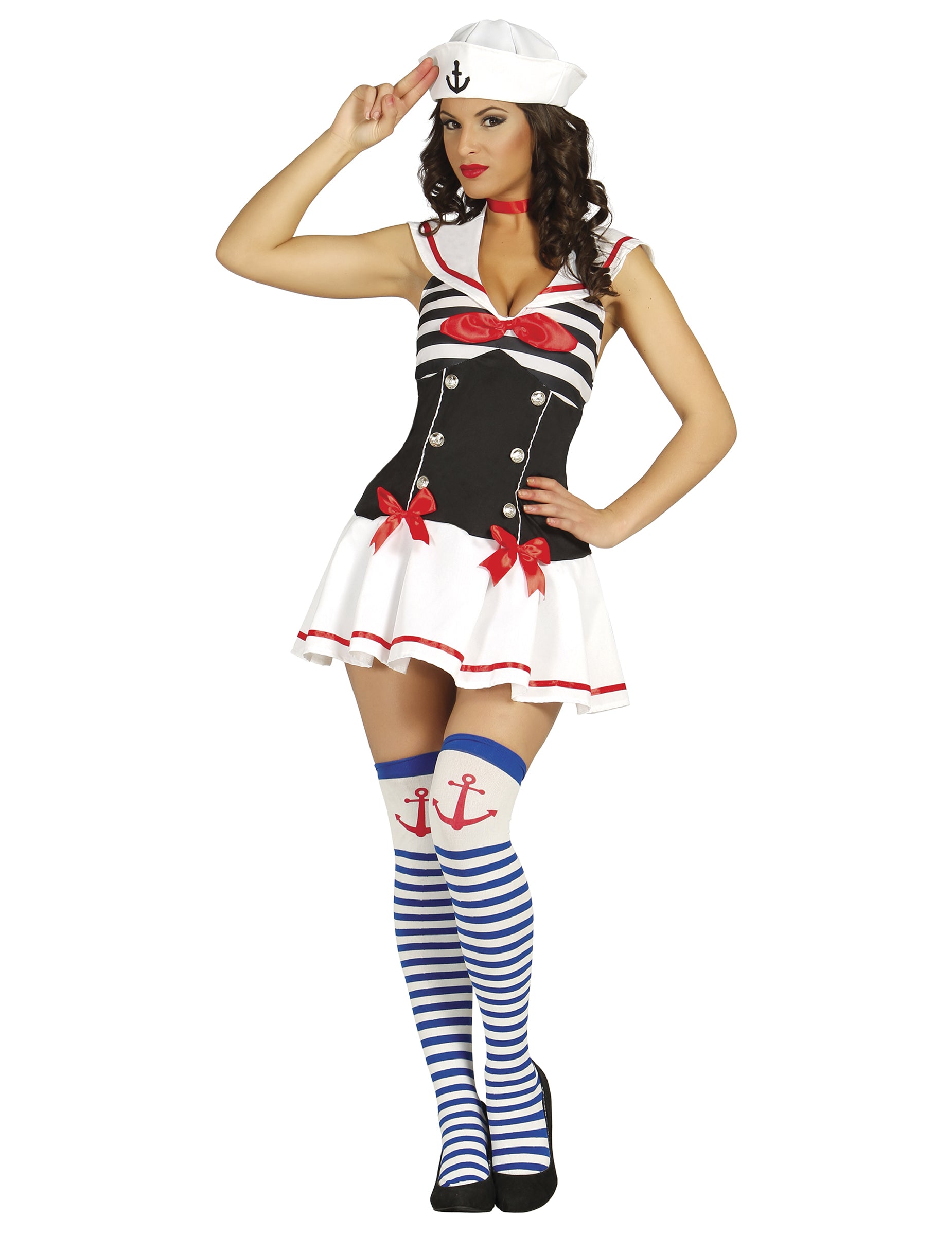Acest costum de marinar sexy pentru femei este format dintr -o rochie și o pălărie (gât, fund și pantofi nu sunt incluse). Rochia goală din spate este scurtă pentru atingerea sexy! Partea de sus este alcătuită dintr -un guler alb mare, cu graniță roșie satinată. Acoperă umerii și partea superioară a spatelui. Marinarul alb -negru este decorat cu un nod roșu din satin mare. Mărimea este arcuită de un corset negru fals cu două benzi albe fine și butoane de argint. Partea de jos este albă cu o bordură roșie satinată, precum și două noduri roșii satinice pe față. Rochia este întreținută folosind un elastic pe spatele gol și se reglează cu două benzi de țesătură în spate. Pălăria de marinar alb va completa această ținută. Are o ancoră de pâslă neagră blocată pe față. Acest costum sexy va fi ideal pentru a capsa toate navele inamice în carnaval sau în timpul unei seri deghizate!