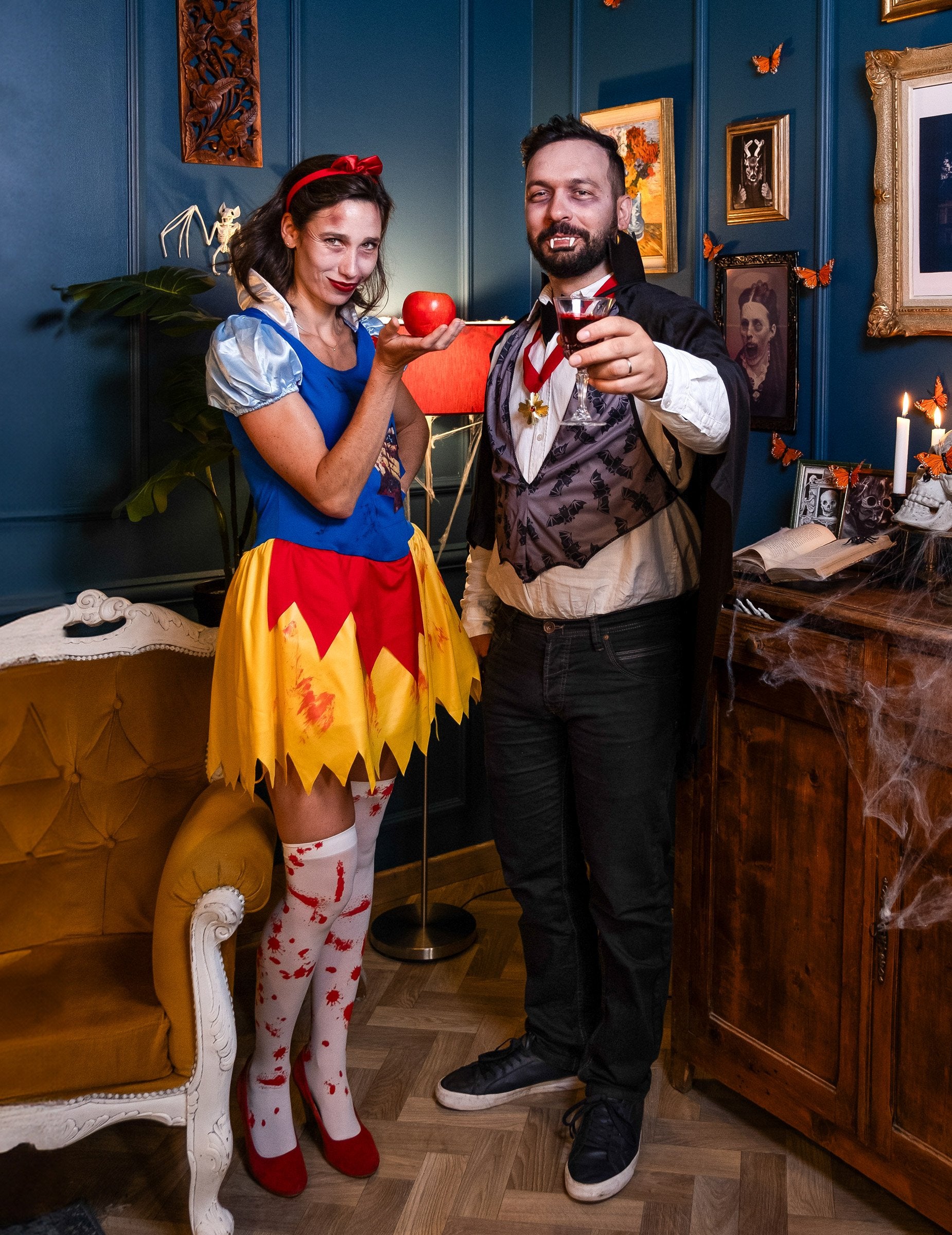 Acest costum de prințesă otrăvit este destinat femeilor și include o rochie și o șapcă. Rochia cu mânecă pufoasă este scurtă și este prevăzută cu un guler sângeros în spumă albă. Bustul este în țesătură fină albastră regală, iar fusta, partea galbenă și roșie, are o căptușeală cu pâslă pentru a da setul de mărime. Sera de cap este roșie și depășită de un mic nod de aceeași culoare. Întregul, într -un efect frumos, este stropit de sânge fals și va fi perfect pentru a juca cartea de originalitate cu ocazia serii tale de Halloween!