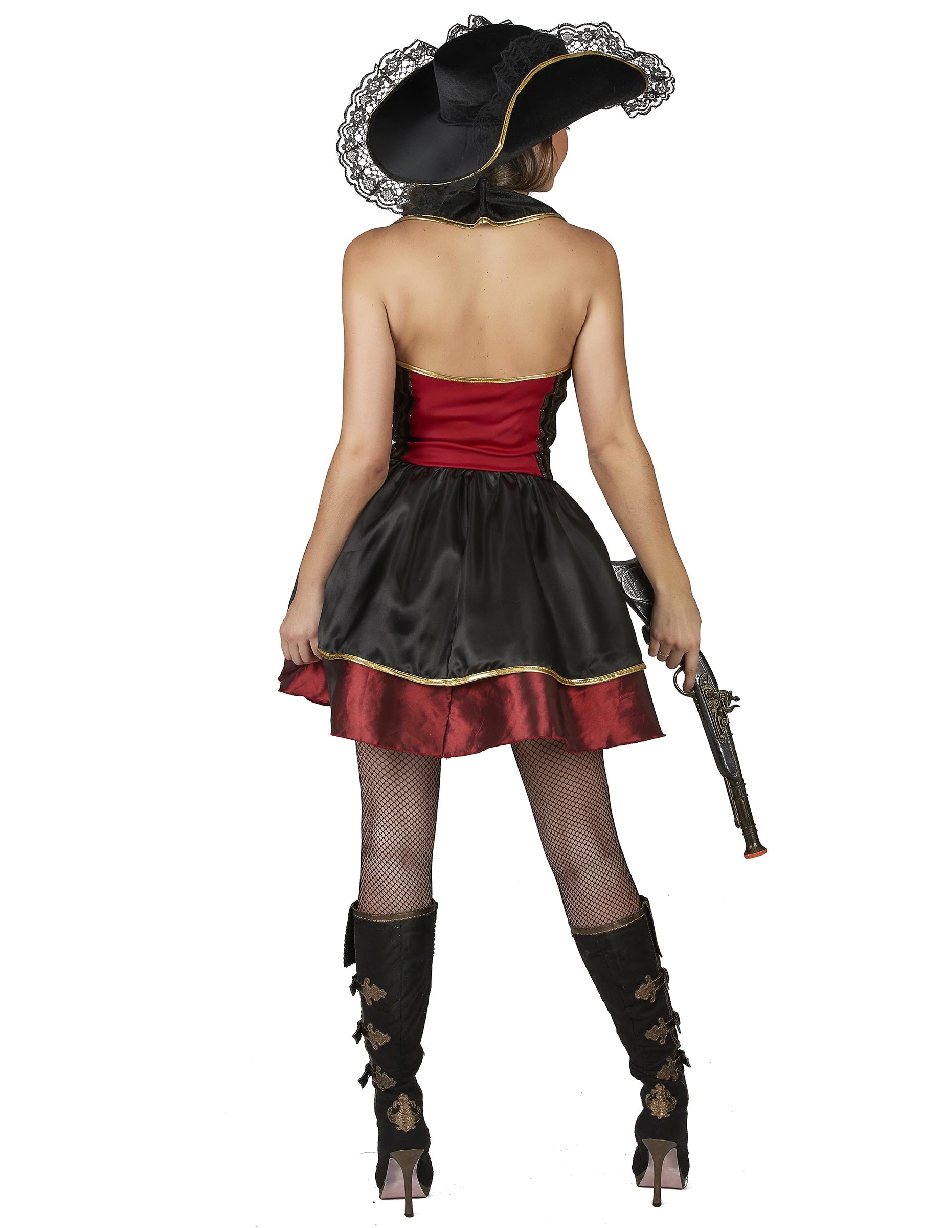 Această deghizare pirat pentru femei include o rochie și o pălărie (colanți, cizme și arme nu sunt incluse). Rochia, verificată la piept este formată dintr -o manipulare mai plină de bustier cuprinzând velur, modele și dungi de paletă. Partea fustei este în 2 suprapuneri de țesături: prima roșie și strălucitoare și a doua bordură de aur cu dungi de sclipici de cupru. Menținerea acestei rochii goale din spate este asigurată de gulerul care este poziționat în jurul gâtului. Pălăriile piratului trebuie să atingă granița cu velur și dantelă. Acesta va fi potrivit pentru turnurile de cap aproape de 60 cm. Acest set de pirați de calitate va fi ideal pentru a juca pirați chic în timpul unei petreceri de costume cu prietenii.