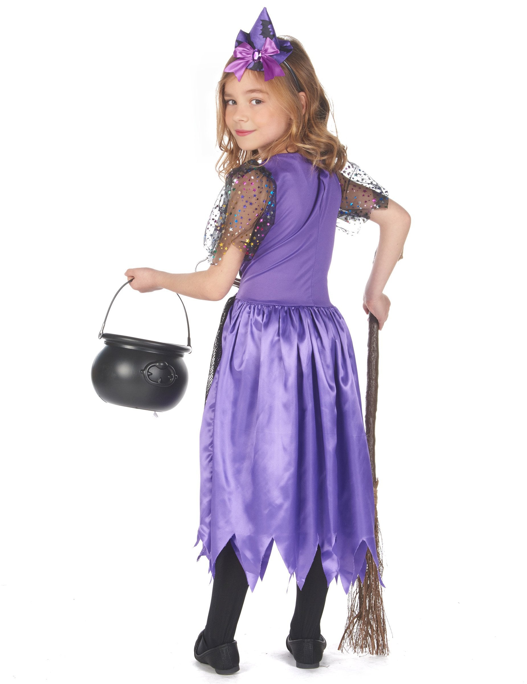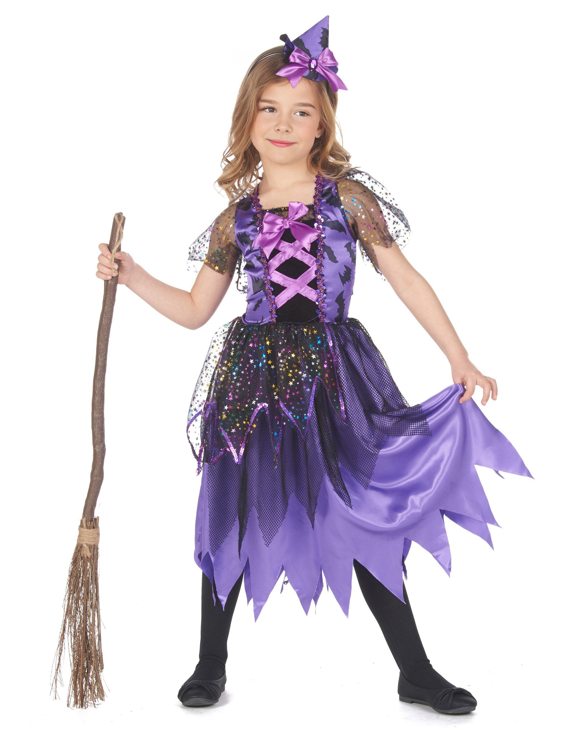 Costumul ăsta de vrăjitoare pentru fată este format dintr -o rochie și o bandă de cap (colanți și încălțăminte nu sunt incluse). Partea de sus a rochiei este satin, de culoare violet cu modele de lilieci. O dantelă falsă este prezentă pe față. Mânecile scurte sunt în voal negru cu stele colorate. Partea de jos a rochiei este violet satinat, tăiat în punct. În partea din față sunt prezente un volan de pește negru și o vele a stelelor. Această rochie se închide în spate cu o zgârietură. Banda de cap este decorată cu o pălărie de vrăjitoare purpurie cu un nod pe față. Acest costum de vrăjitoare va fi perfect pentru Halloween.