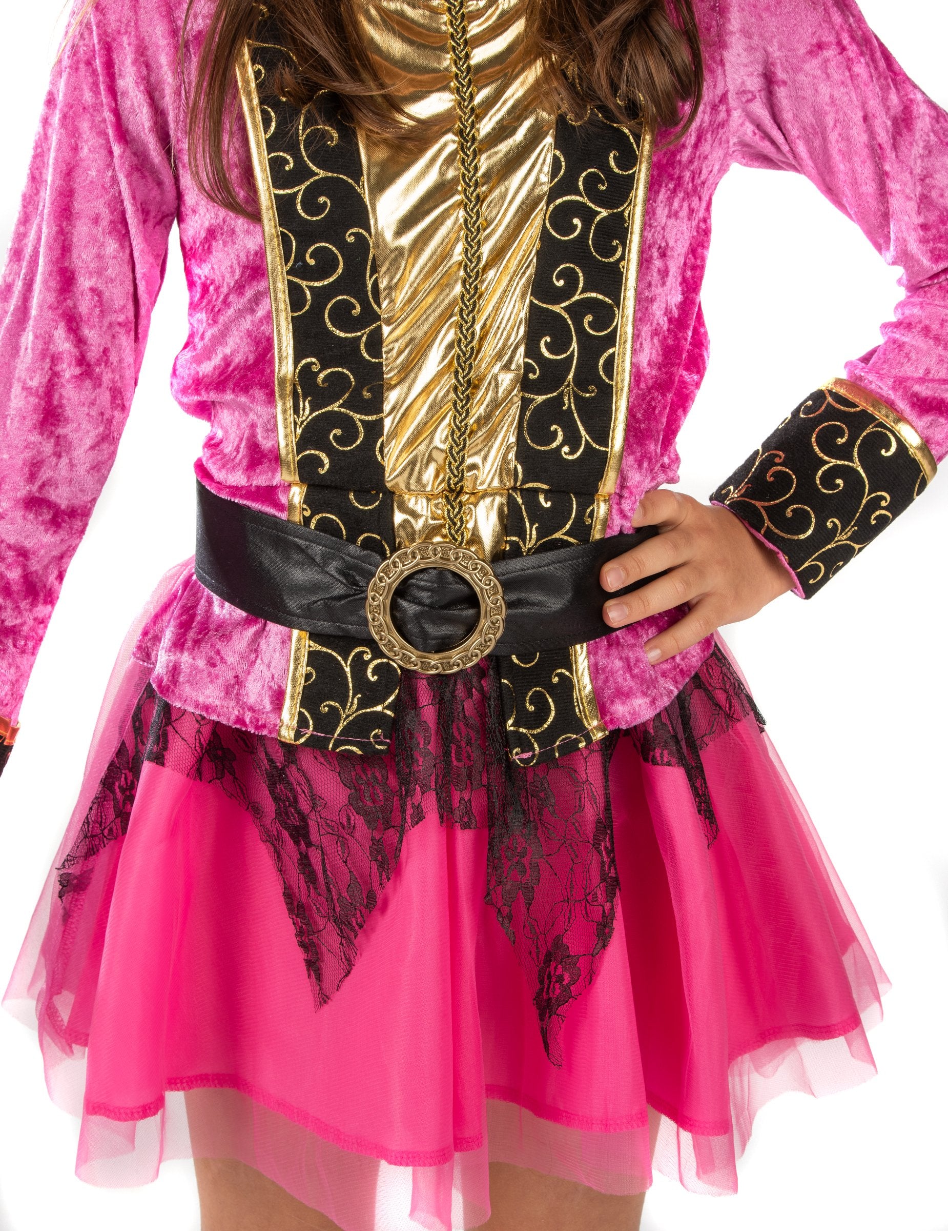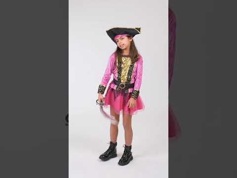 Această deghizare pirat pentru fată include o rochie, o pălărie și o centură. Rochia lungă -sleeved include o parte din sacou de catifea roz și negru strălucitor de aur arabesque, precum și un corset de aur fals strălucitor. Fusta din țesătură flexibilă roz are o căptușeală din tul care adaugă volum întregului. Pălăriile de pirat vor fi potrivite pentru turnurile de cap aproape de 56 cm aproximativ. Fabricat din pâslă neagră groasă, o fâșie de catifea roz este prezentă ca o amintire a rochiei. Centura este neagră cu buclă de plastic. Țesătura sa evocă aspectul pielii și zgârieturi în spate. Această deghizare pirat este ideală pentru o fetiță fan a poveștilor piratelor. Ea va fi un căpitan perfect în timpul unei gustări de naștere sau pentru carnaval.