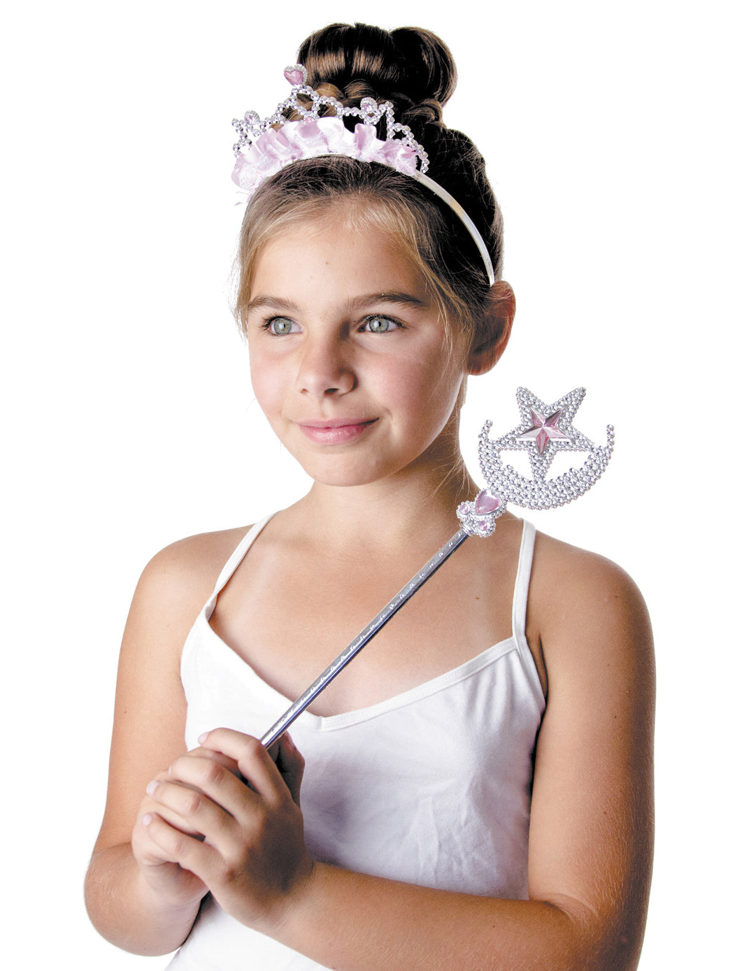 Acest lot este format dintr -o bandă de cap și o baghetă. Banda este confecționată din plastic argintiu. Reprezintă o coroană cu strasuri roz, alături de o bandă roz din satin. Bagheta potrivită are o stea și o lună la sfârșitul ei. Măsoară aproximativ 33 cm lungime. Acest kit va fi perfect pentru completarea costumului prințesei fiicei tale.