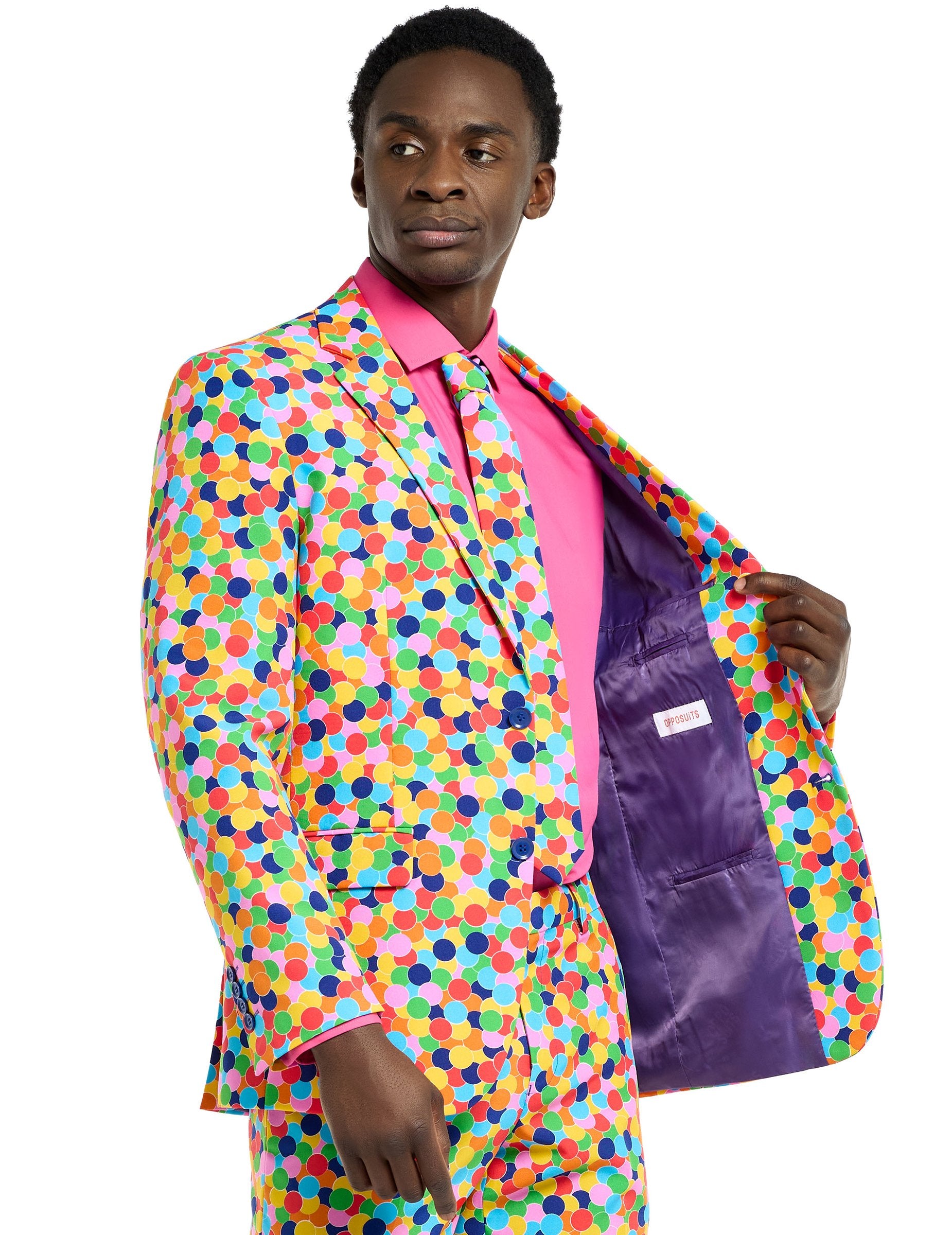 Acest costum. Jacheta perfect curbată este decorată cu două buzunare false pe față și se închide cu două butoane albastre. Clesterii Panatalon are două buzunare laterale și se închide cu un fermoar și un buton. Legătura este legată în jurul loviturii și aduce ultima atingere costumului. Cu acest costum ciudat care pare făcut din confetti, veți fi chic și original în toate circumstanțele.