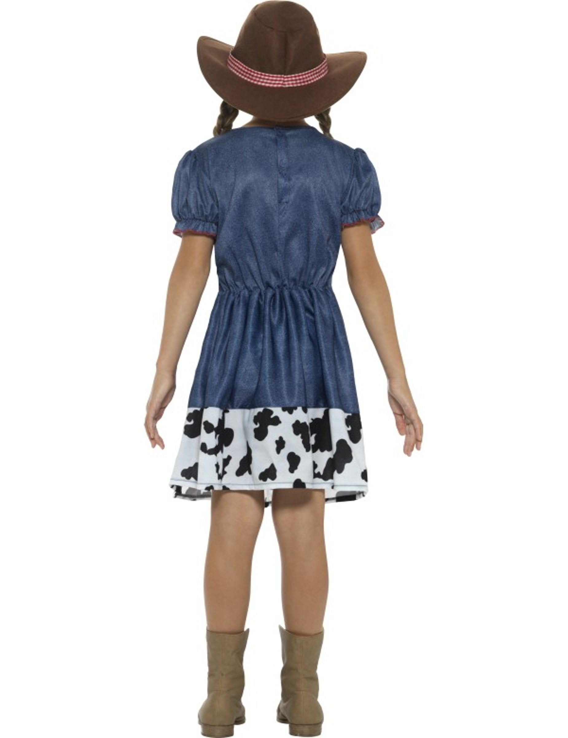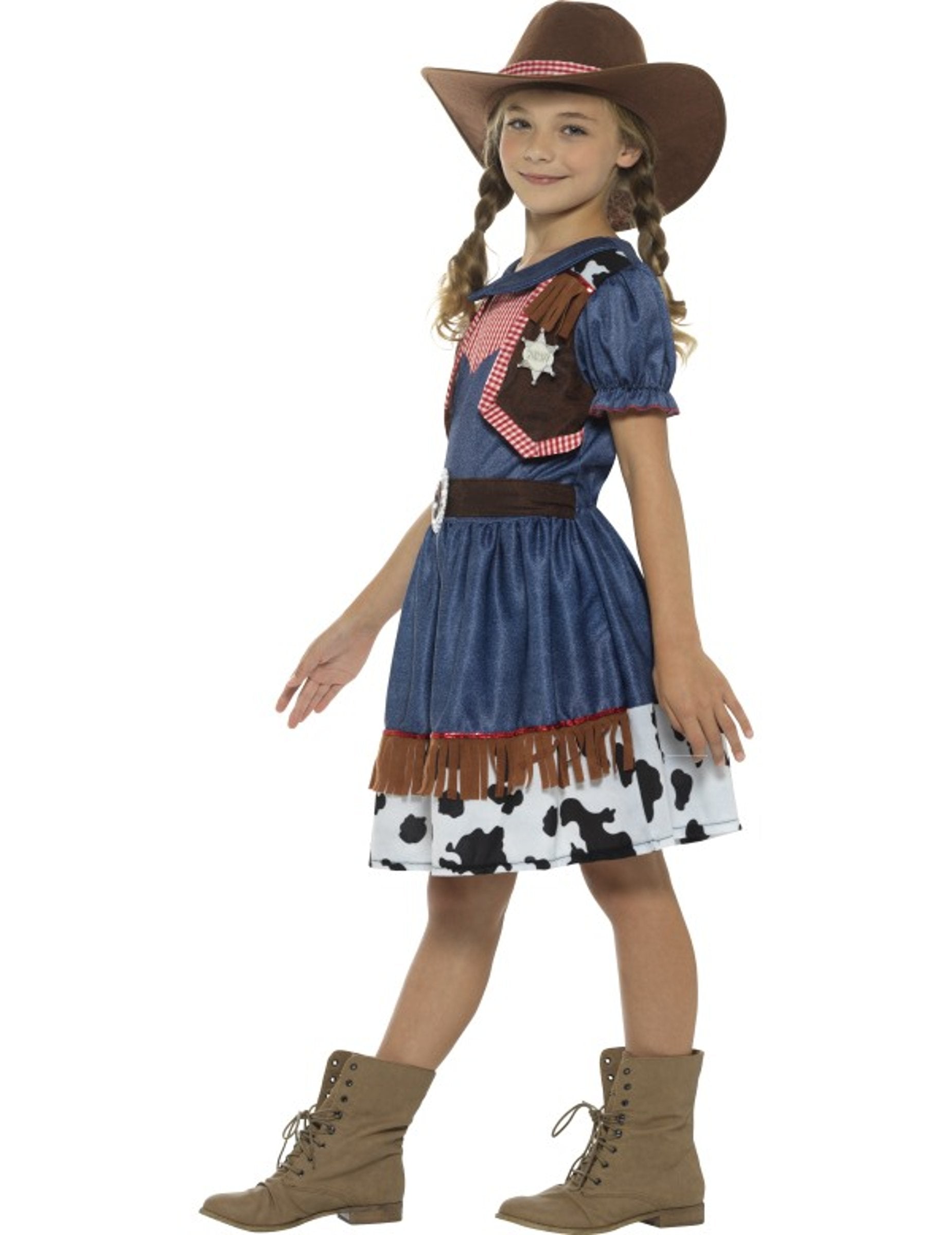 Acest set pentru fată include o rochie cu vestă și o pălărie (cizme care nu sunt incluse). Această rochie este albastru de blugi. O vestă maro decorată cu o stea argintie este cusută cu rochia. O centură maro falsă este, de asemenea, integrată în rochie. Această rochie are un imprimeu frumos de vacă în partea de jos, precum și în francuri. În ceea ce privește pălăria, este maro și are o bandă imprimată cu un model alb și roșu. Acest deghisemnet texan texan va fi ideal pentru fiica ta în timpul carnavalului!