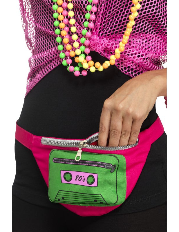 Această geantă cu banane este multicoloră. Este roz și are o casetă verde destul de imprimată. Inscripția „80” este, de asemenea, prezentă în față. O închidere ușoară vă permite să închideți banana. Îl vei purta cu ușurință în jurul taliei. În mod ideal, va completa o ținută în stilul anilor 80 în timpul unei seri deghizate!