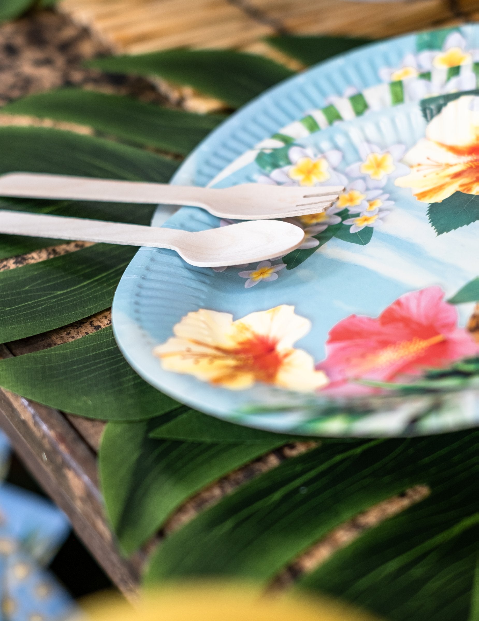 Acest lot este alcătuit din 18 tacâmuri de lemn crude: 6 furci, 6 linguri și 6 cuțite. Au 16 cm înălțime. Aceste tacâmuri vor fi perfecte pentru o masă naturală în timpul unei petreceri de naștere sau pentru o masă de nuntă frumoasă.
