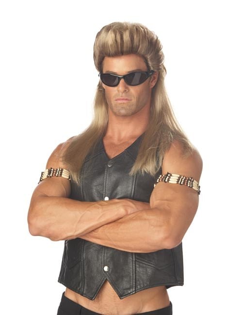 Această perucă de vânător blondă pentru bărbați este alcătuită din părul artificial blond care ajunge pe umeri. Pentru a perfecționa partea de vânător bonus, părul este măturat deasupra. Această perucă poate însoți o ținută de hochei sau vânător de bonusuri.