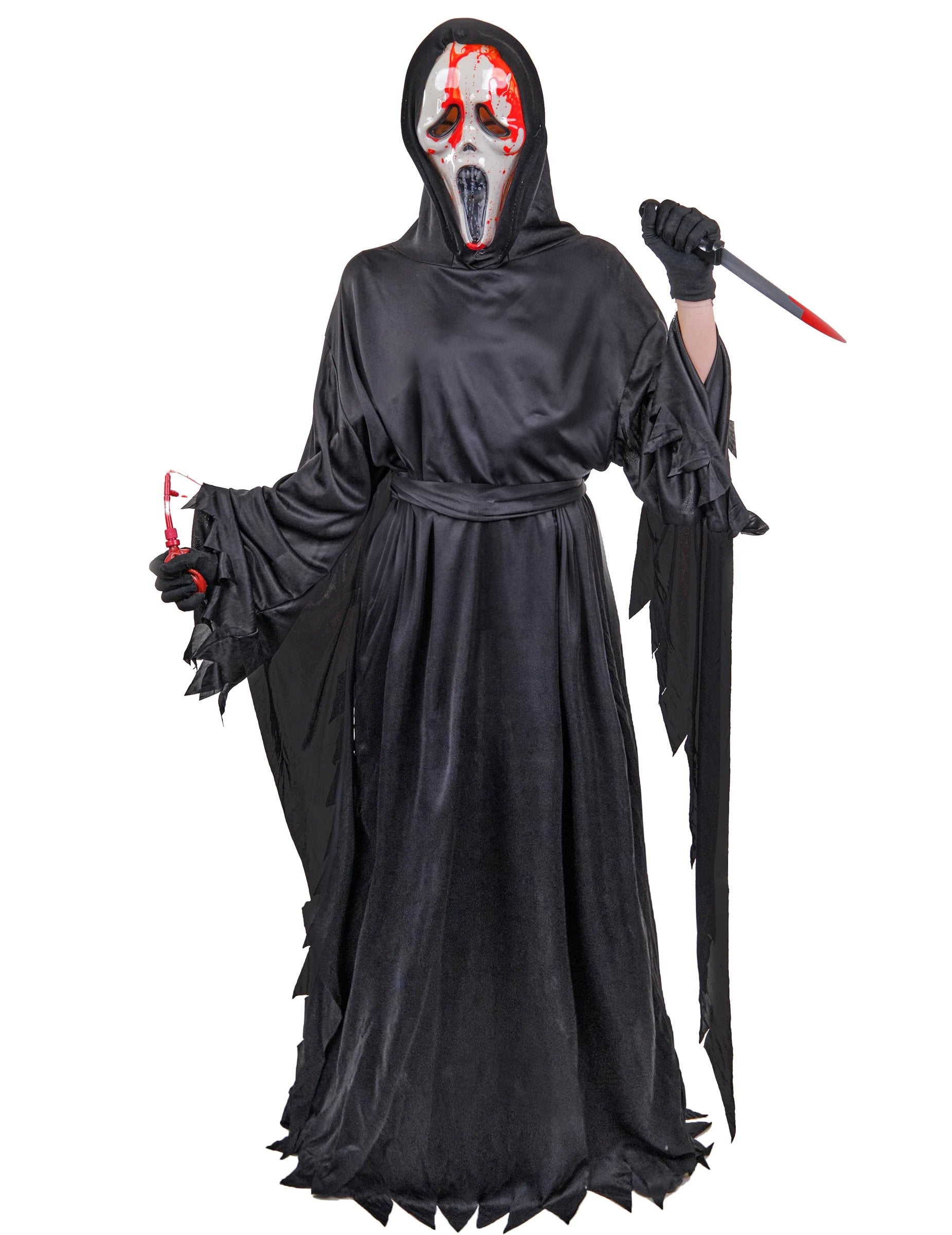 Acest costum de țipăt sângeros este pentru adulți. Sub licența oficială, este formată dintr -o rochie cu glugă, o centură, o pereche de mănuși și o mască cu sânge fals integrat. Glugă are o culoare neagră simplă, cu mâneci largi tăiate în vârfuri. Centura este o bandă de țesătură neagră care este legată la talie. Mănușile sunt, de asemenea, unite negre. Masca reprezintă celebrul criminal al seriei de filme Scream. Este conectat printr -un furtun la o pompă falsă de sânge. Când îl apăsați, sângele fals va curge în mască, pentru cel mai mare fior dintre cei care vă vor traversa drumul! Această deghizare completă va fi perfectă pentru Departamentul de Halloween deghizat seara.
