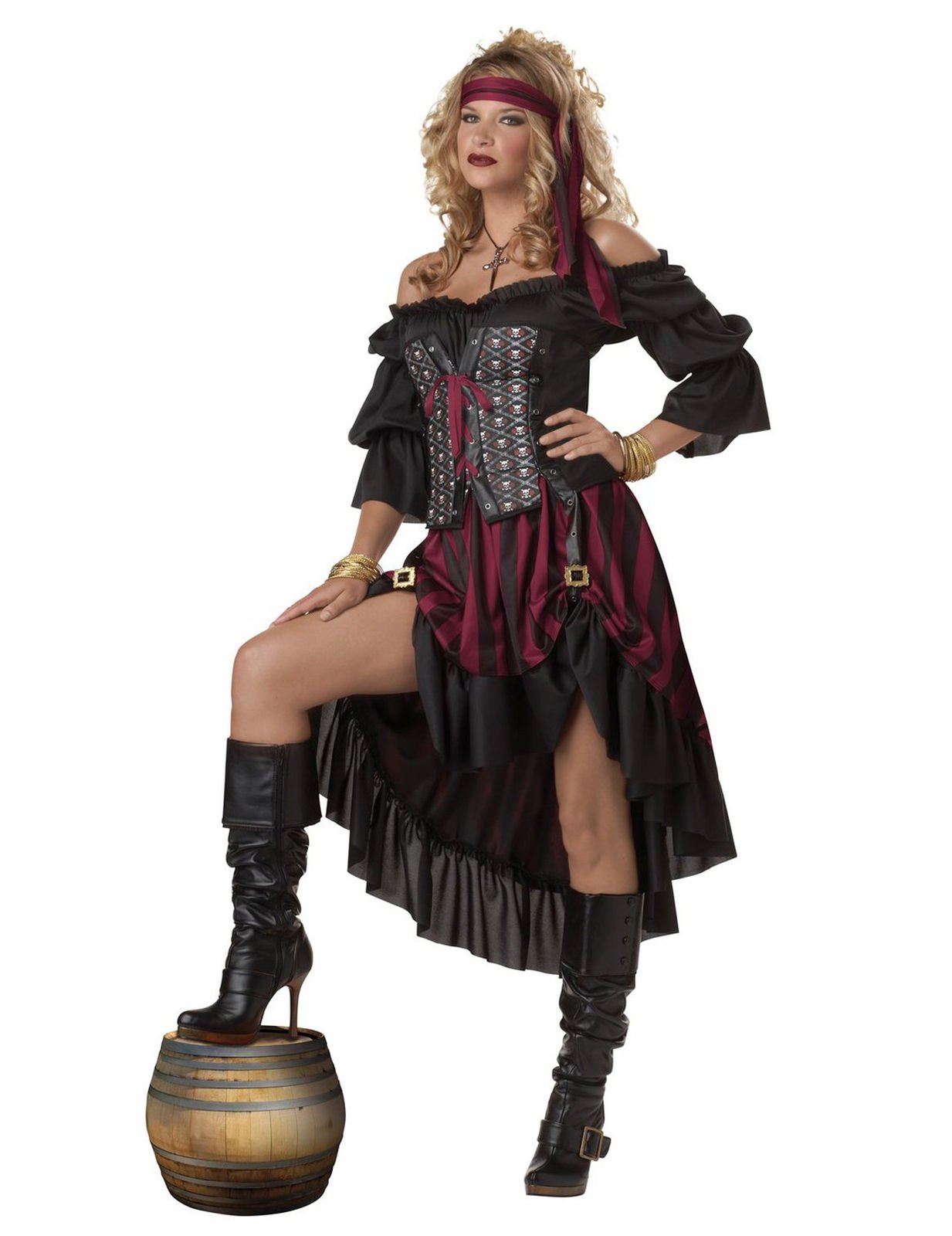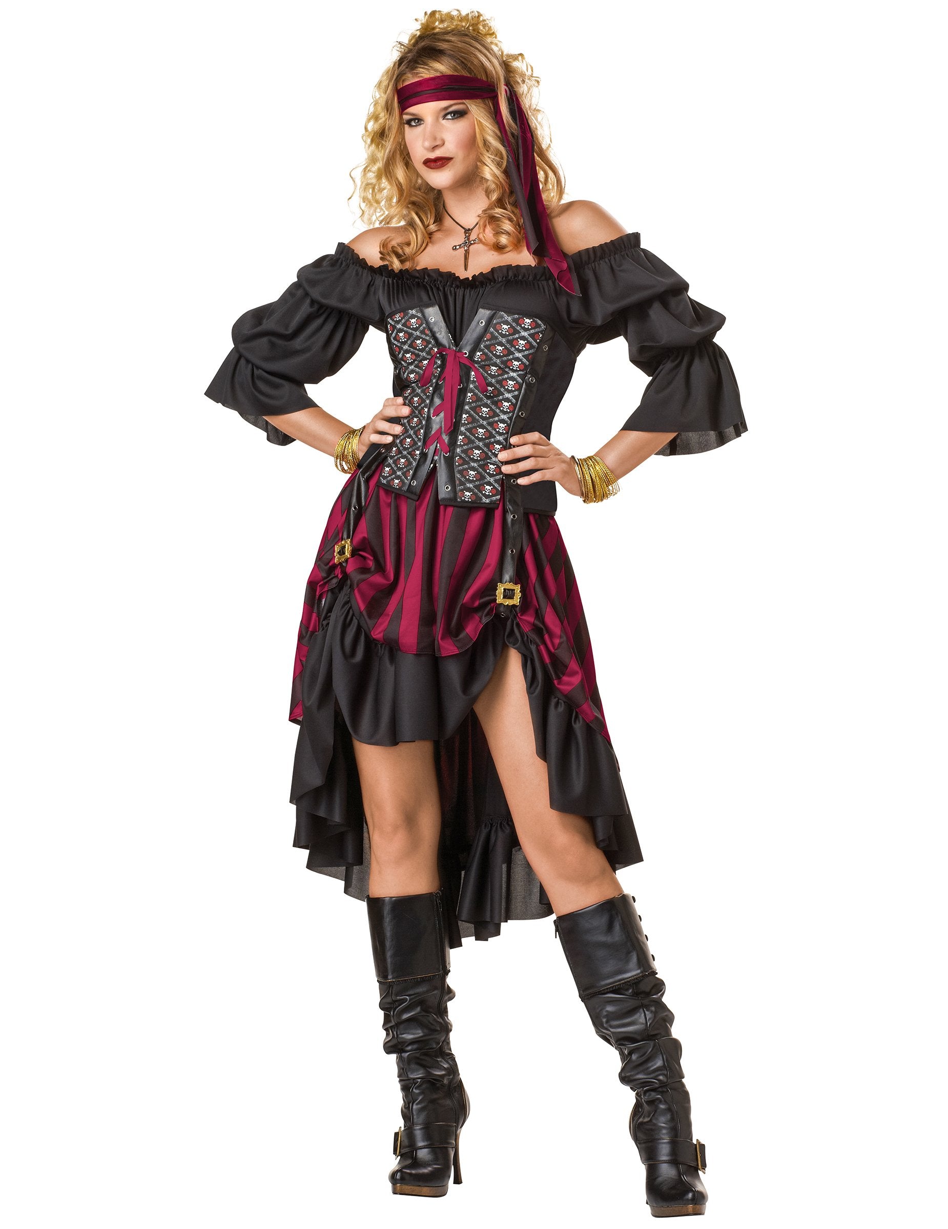 Acest costum de femeie pirat negru este alcătuit dintr -o rochie, un corset și o bandană. Partea de sus a rochiei este un corset negru atașat cu o panglică de visiniu care marchează talia. Fusta este asimetrică, mai scurtă în față decât în ​​spatele și în dungi negre și visiniu. În cele din urmă, Bandana, de asemenea, Bordeaux vă permite să creați o coafură de pirat. Acest costum de femeie pirat negru va fi perfect pentru Carnaval sau Halloween.