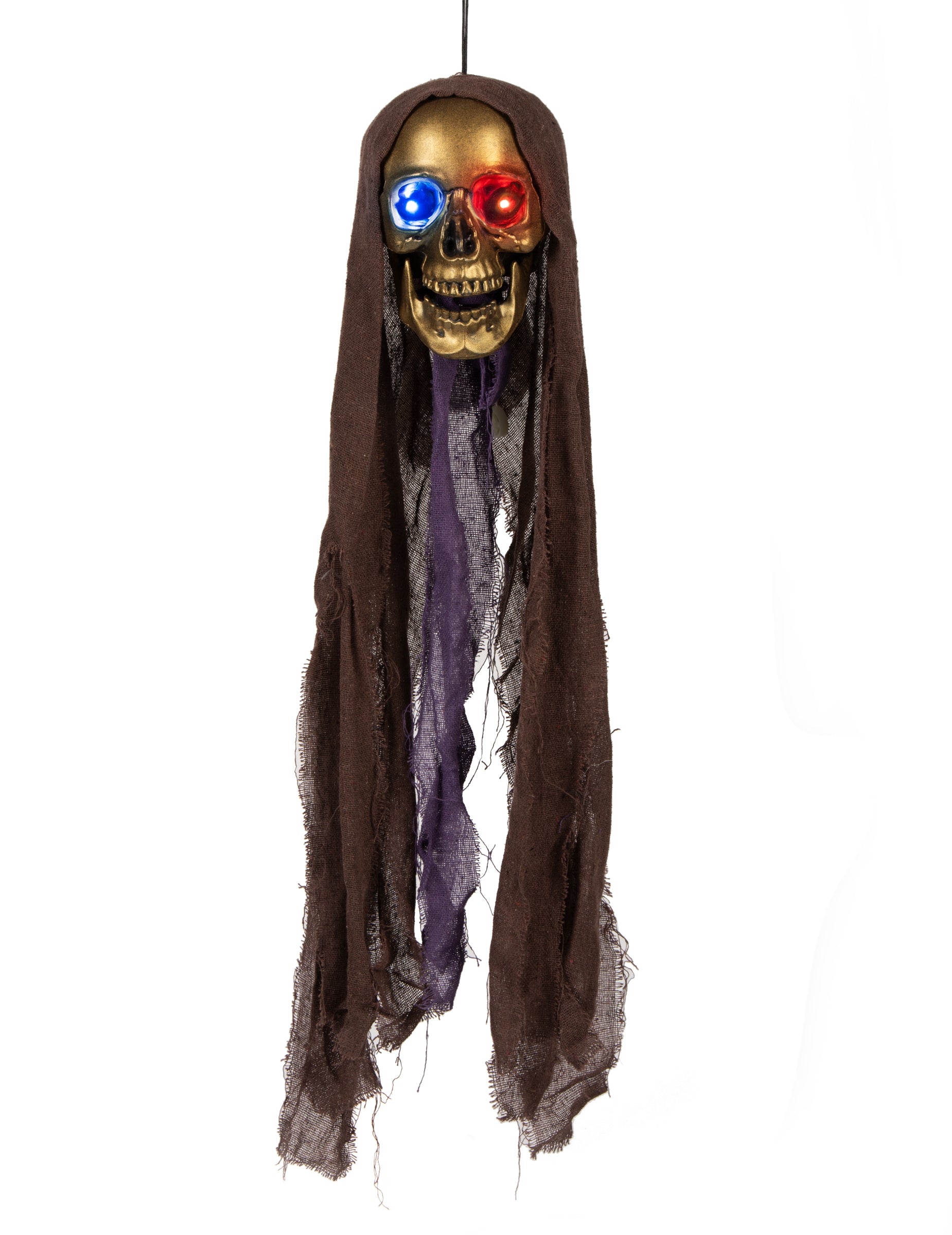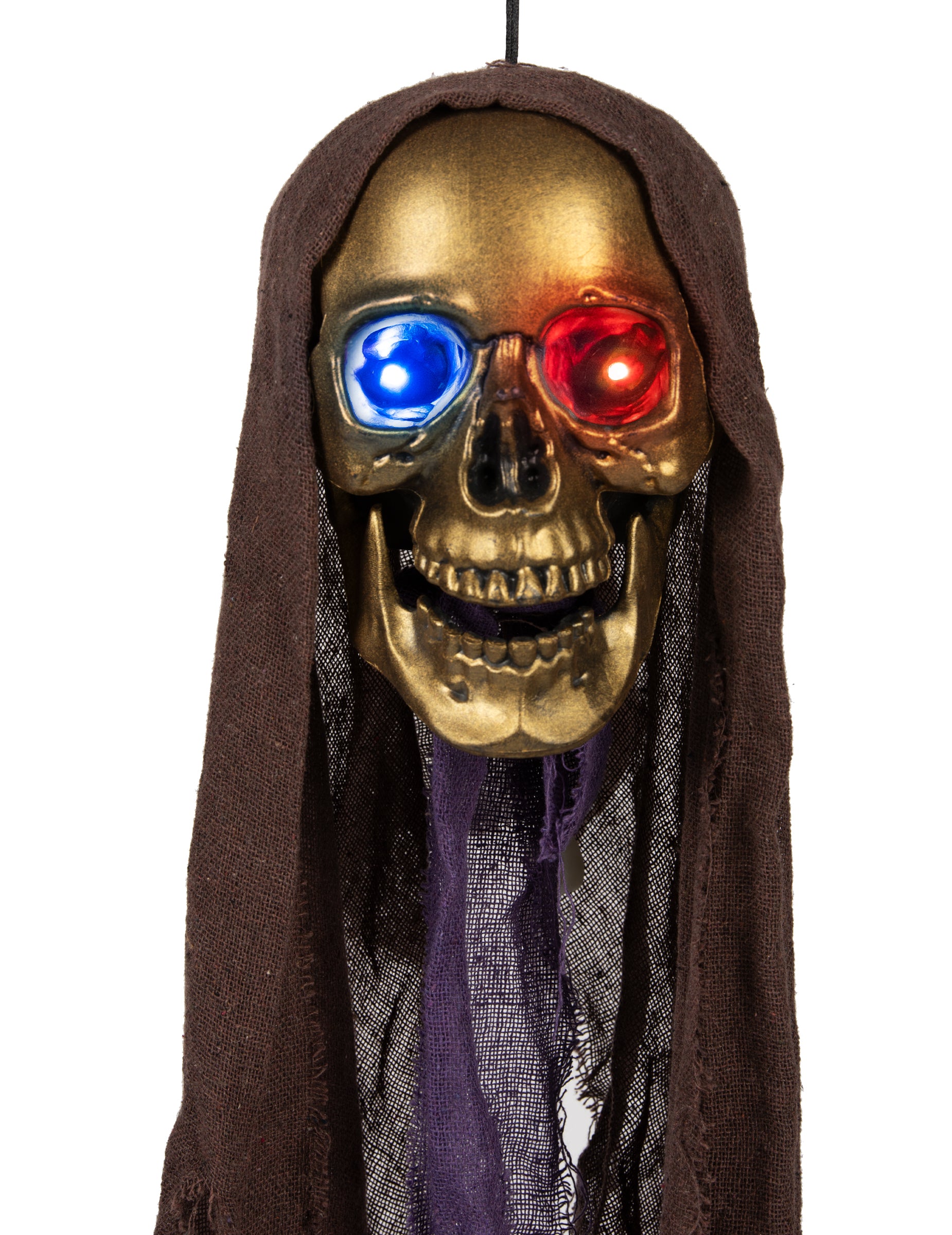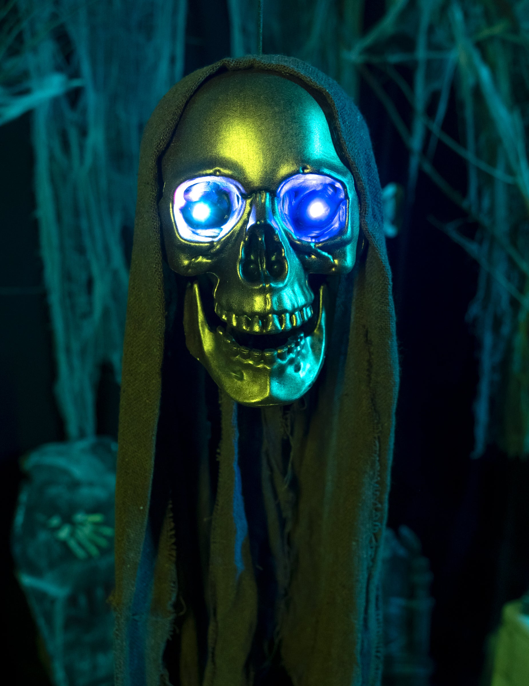 Iată un superb cap de schelet cu o patină care amintește de cuprul uzat. Cu vălurile sale rupte și fălcile larg deschise, cu siguranță va speria pe mulți. Cea mai bună caracteristică a sa? Cu 3 baterii buton LR44 incluse, decorațiunea va face ochii să strălucească în toate culorile. O priveliște care ar putea speria chiar și cel mai pretențios ochi dacă decorațiunea este în grădină noaptea. În noaptea de Halloween, lasă-ți imaginația să zburde pentru a crea o decorațiune terifiantă care le va da fiori prietenilor tăi!