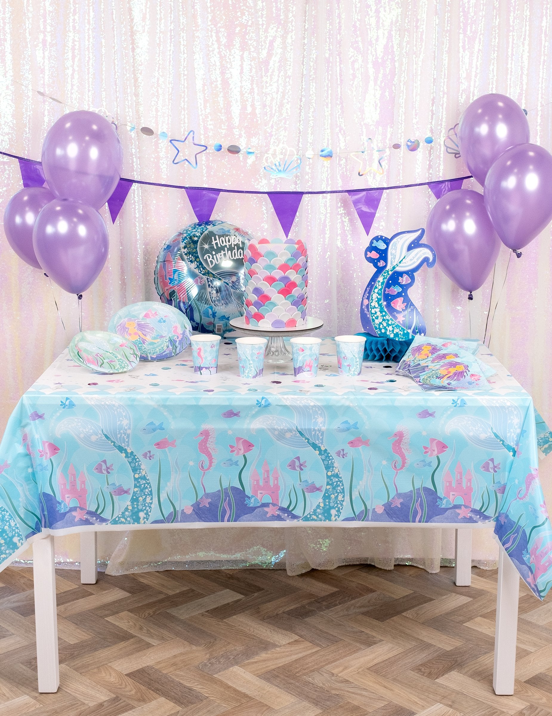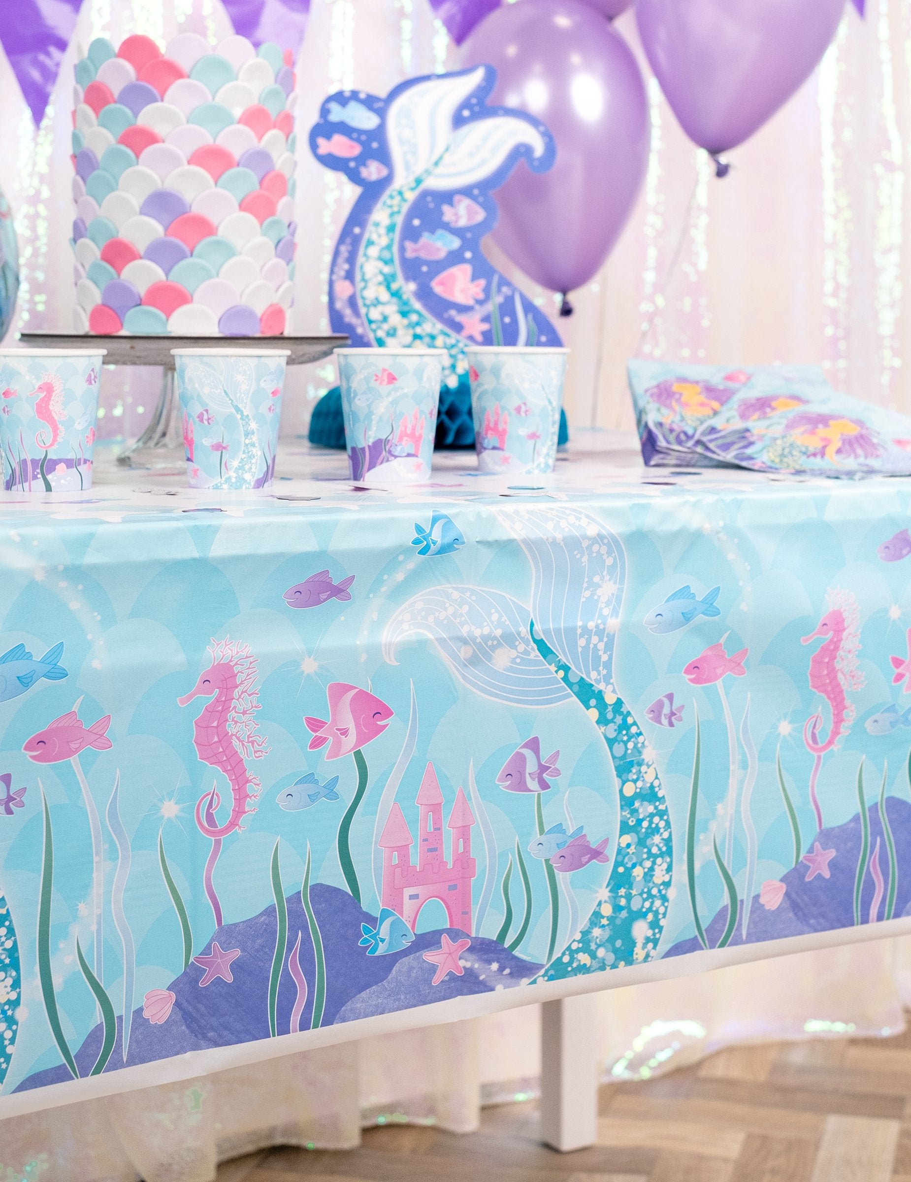 Această **frumuseța față de masă cu model de sirenă**, fabricată din plastic, măsoară aproximativ 137 x 213 cm. Este decorată cu un imprimeu superb cu o sirenă care se scufundă în adâncurile mării. Designul prezintă o coadă de sirenă, peștișori, căluți de mare și diverse scoici în fața unui castel roz magic. Această față de masă este perfectă pentru a crea o masă cu tematică de sirenă pentru petrecerea de ziua de naștere a fiicei tale.
