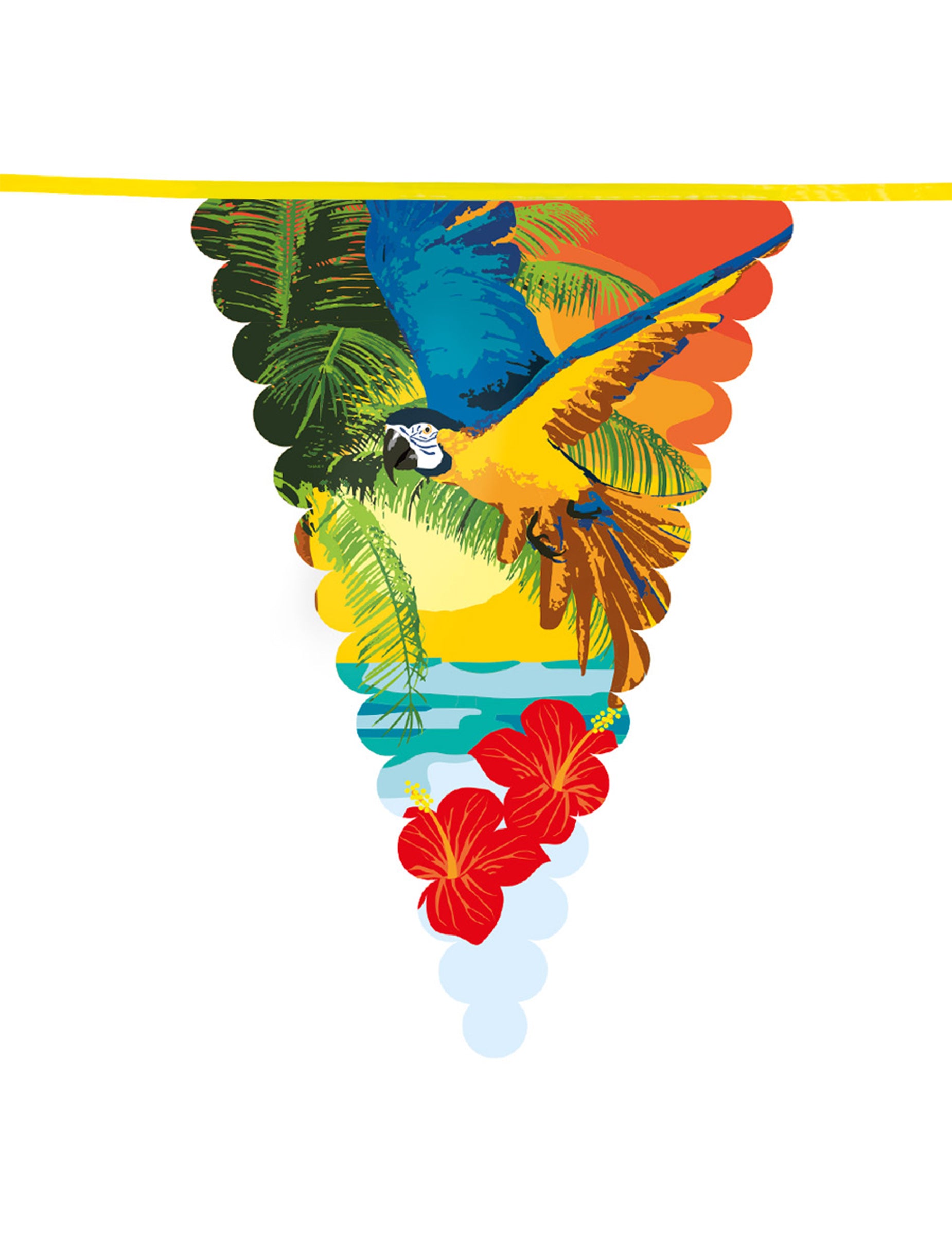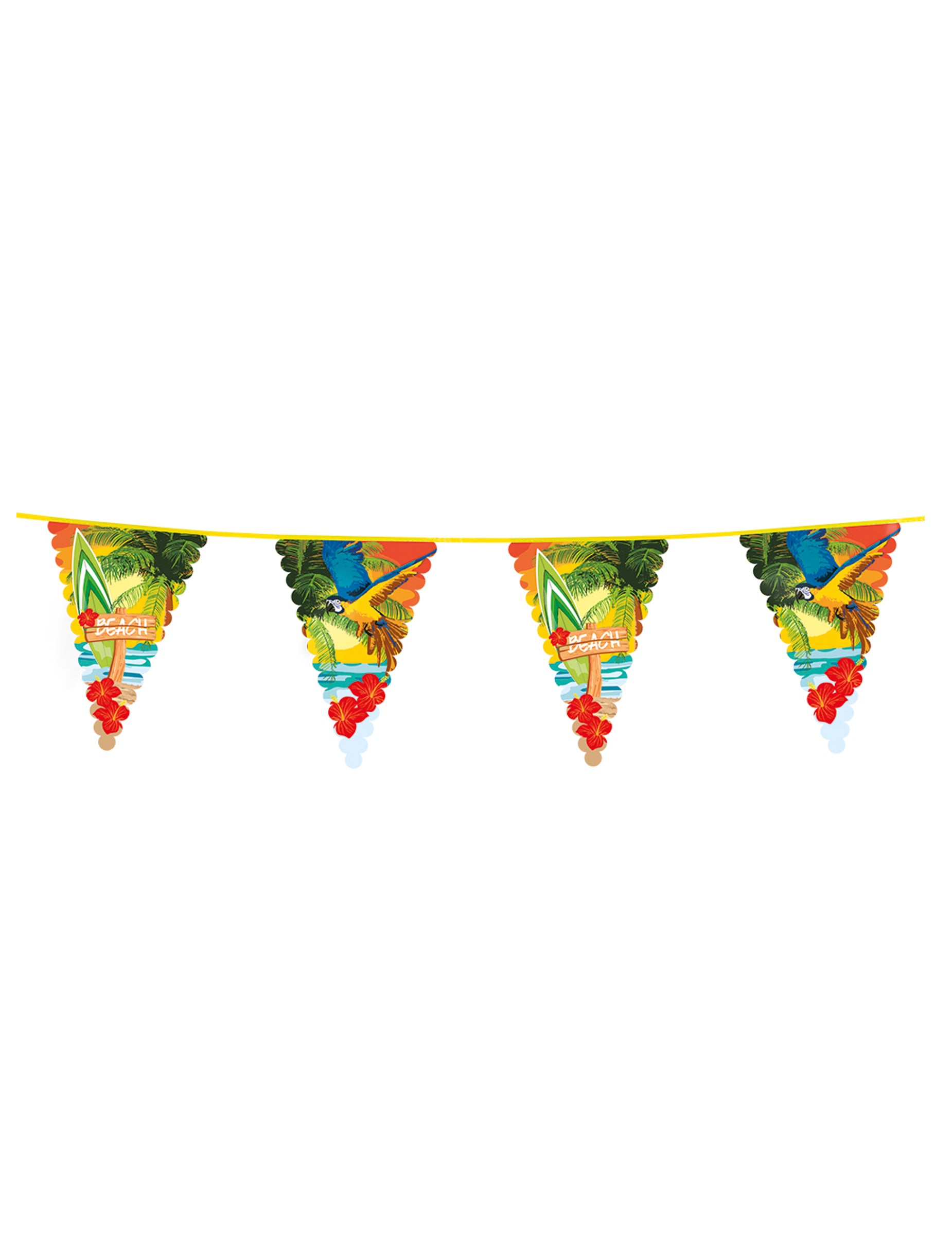 Această ghirlandă „Petrecere de plajă” este formată dintr -un cordon de plastic galben de 6 metri înfrumusețat cu pennante mari de 46 cm înălțime pentru 30 cm lățime. În plastic fin și flexibil, aceste pennante se vor mișca cu ușurință în funcție de vânt. Indispensabil pentru un decor aerian pe tema Hawaii, plajă și vară.