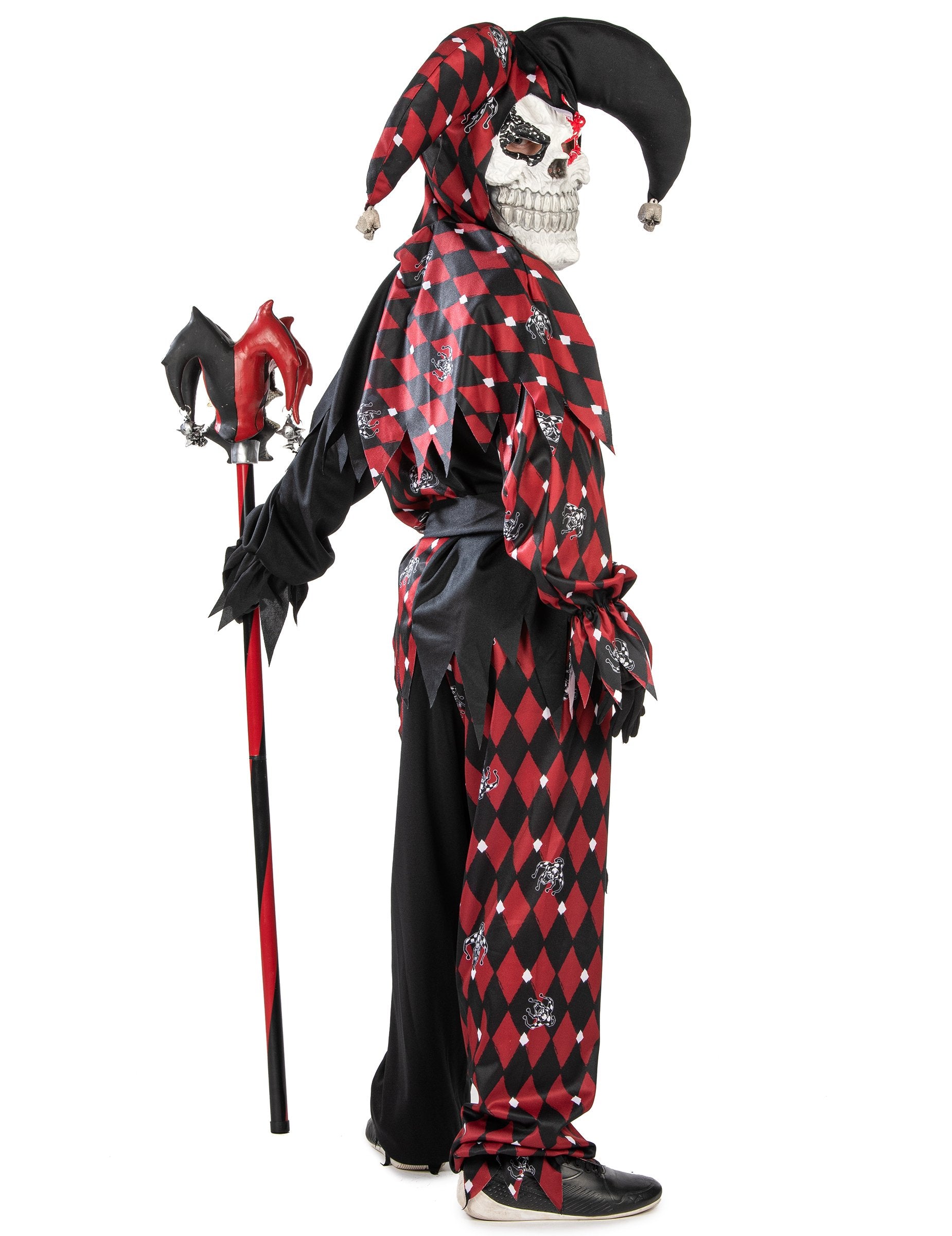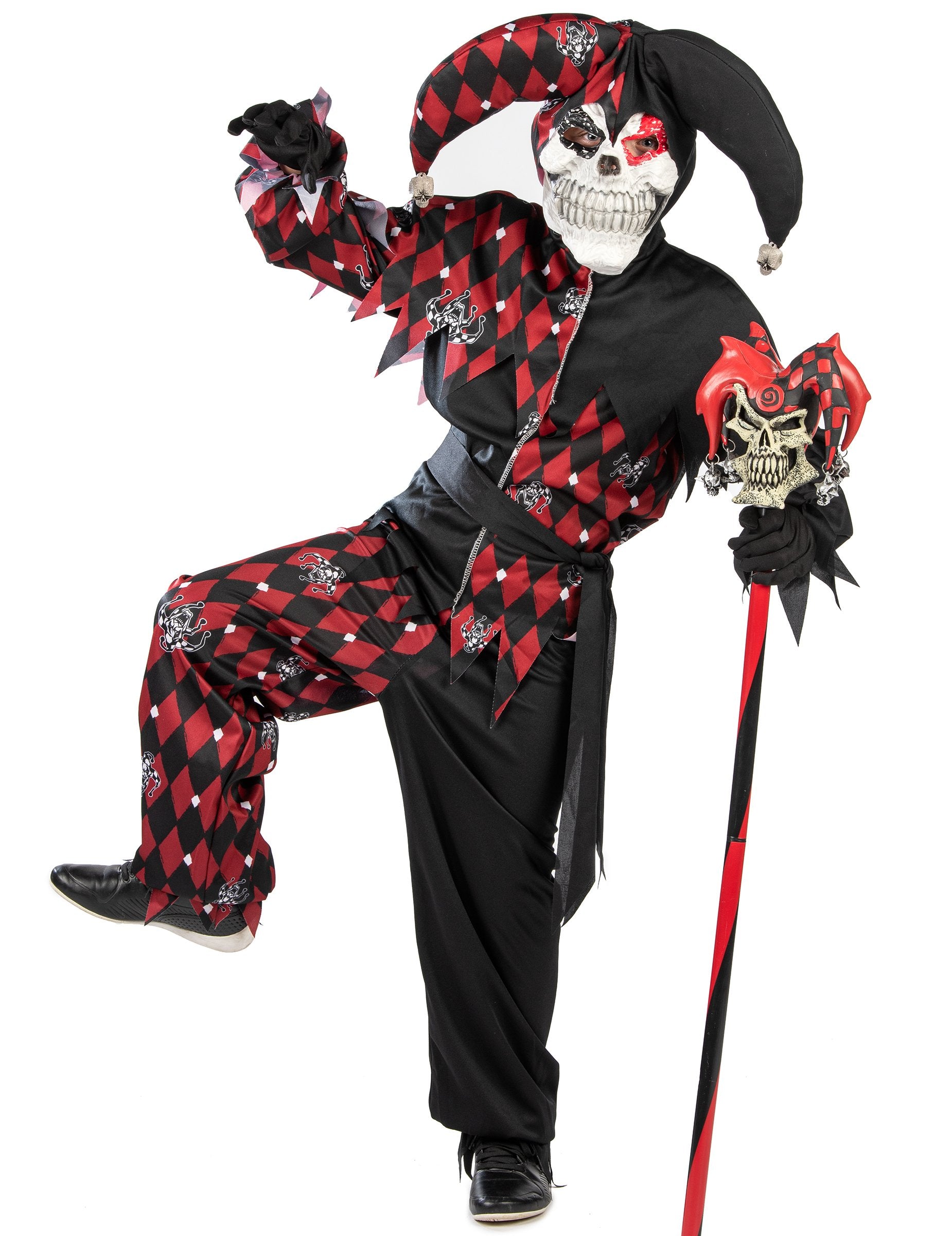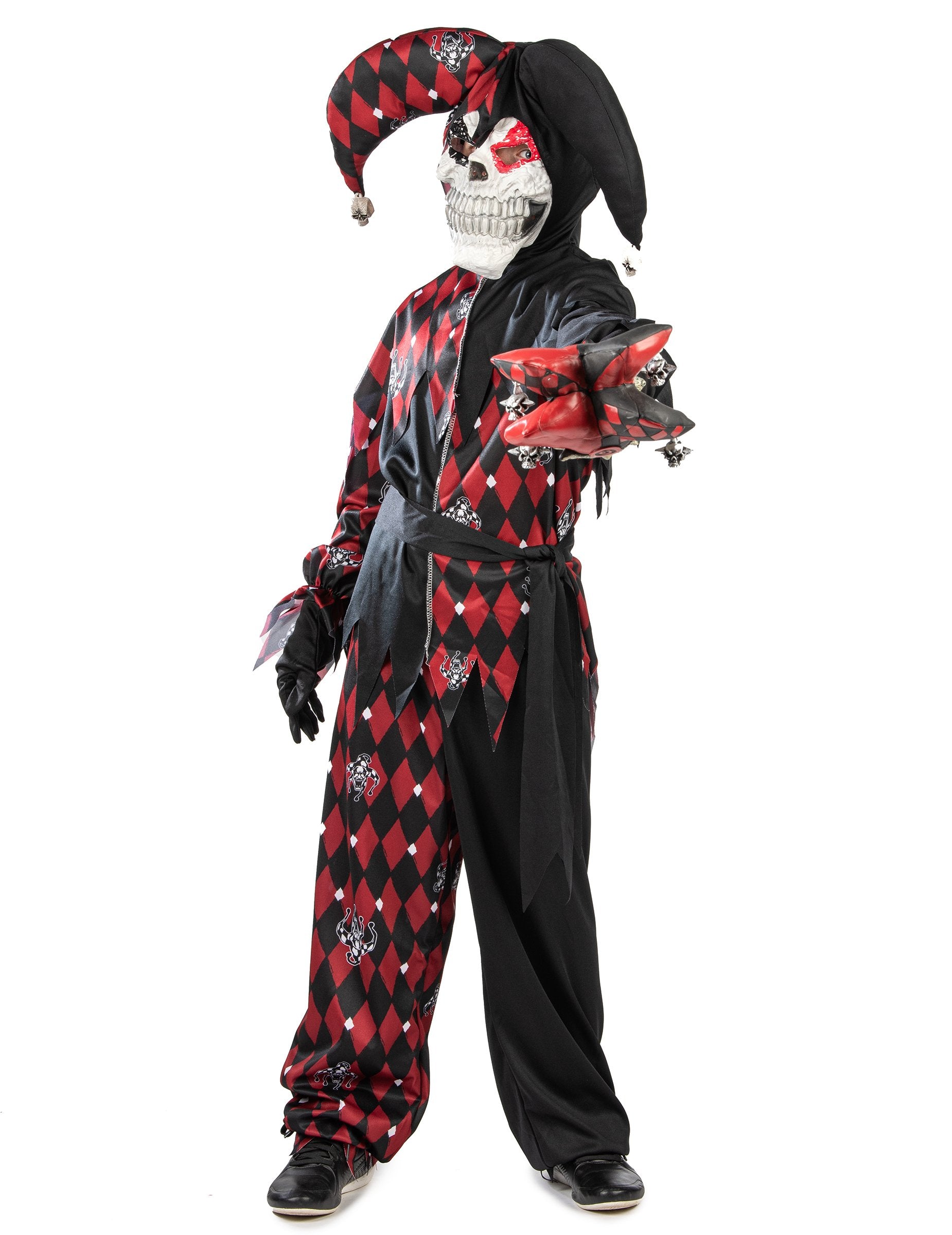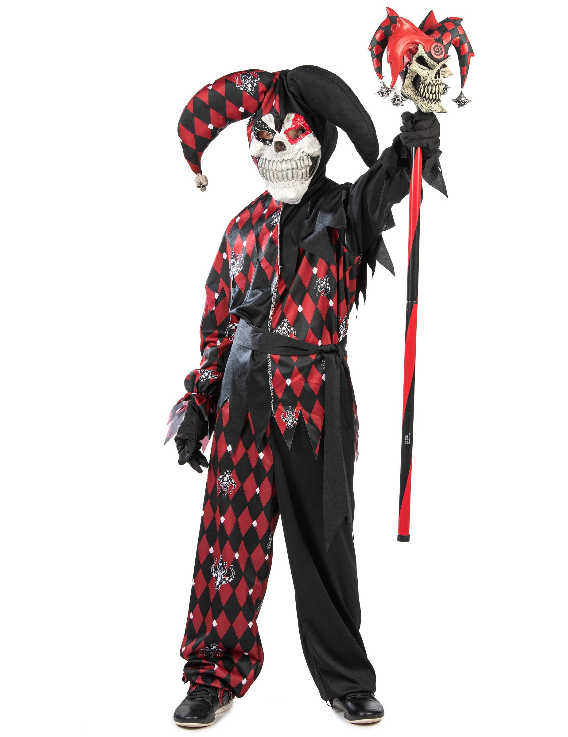 Acest costum de bufon pentru copii Se compune dintr-o glugă, o mască, un top, pantaloni și o curea.