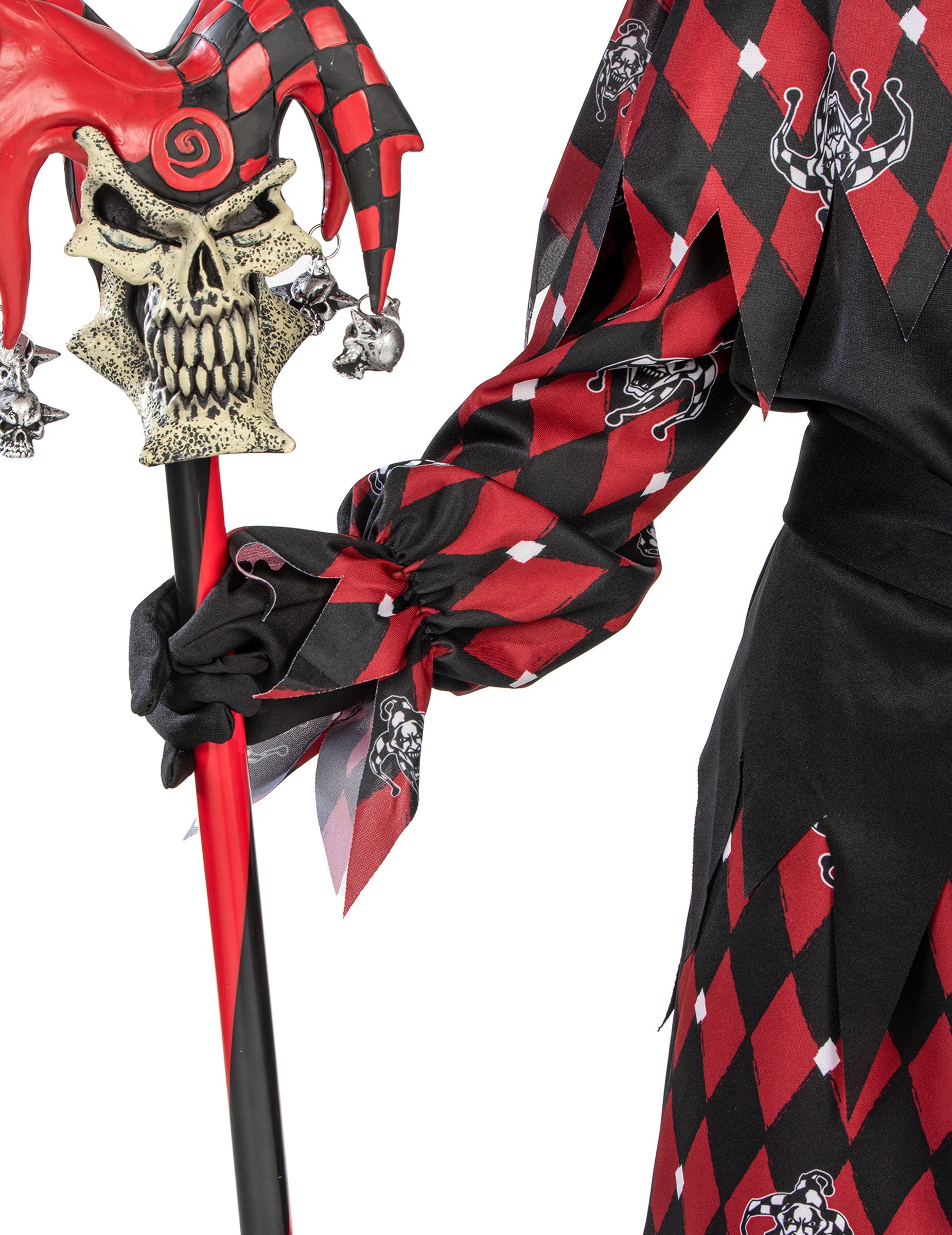 O parte a ținutei este neagră, cealaltă parte este confecționată dintr-un material imprimat cu diamante negre și roșii.