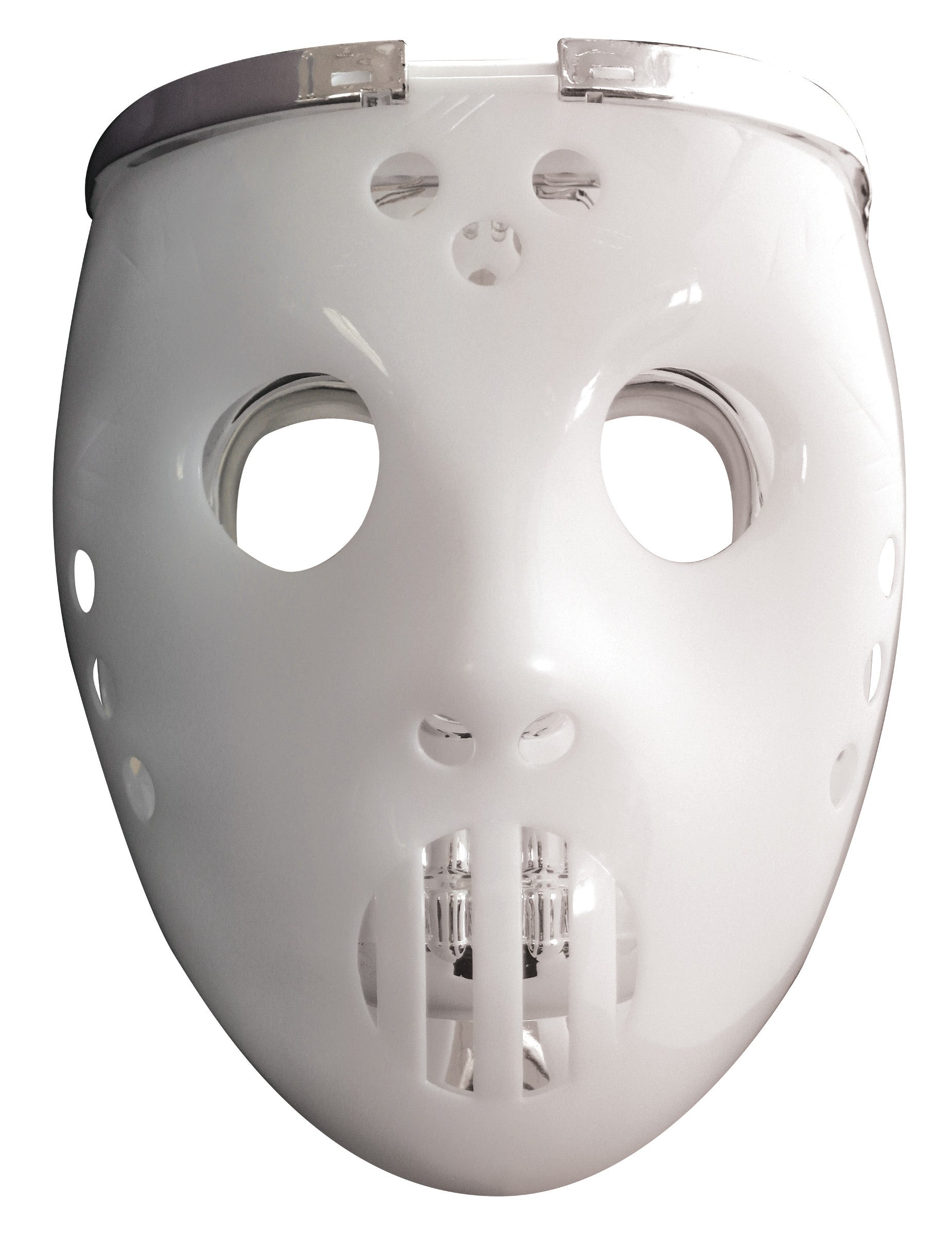 Această mască de hochei este strălucitoare și alb (sunt furnizate 2 baterii CR2016). Este menținut de un elastic. Găurile din ochi, nas și gură vă vor permite să respirați ușor. În plus, forma măștii și a grilei care ascunde gura amintește de masca unui criminal celebru. Pe lângă faptul că este strălucitor, această mască are particularitatea de a ascunde o a doua mască! Într -adevăr, puteți ridica masca de hochei și sub ea este un craniu care apare! Acest accesoriu va fi perfect pentru a -ți completa costumele ucigașe în serie și pentru a -și da frica vieții lor prietenilor tăi, în timpul Halloween -ului sau unei petreceri deghizate pe tema groazei.