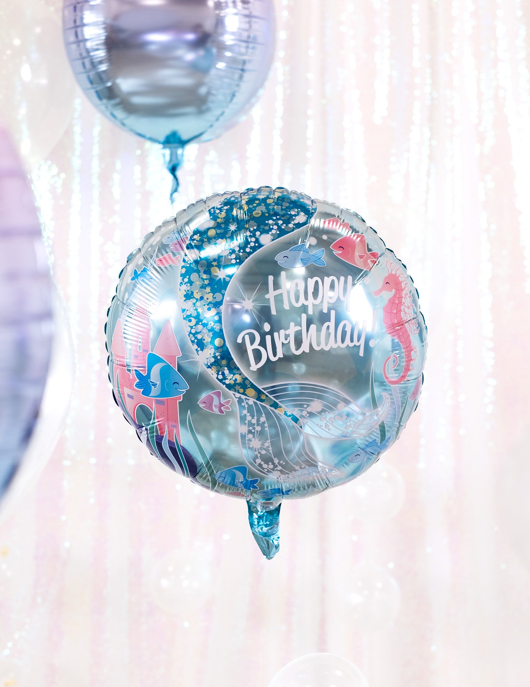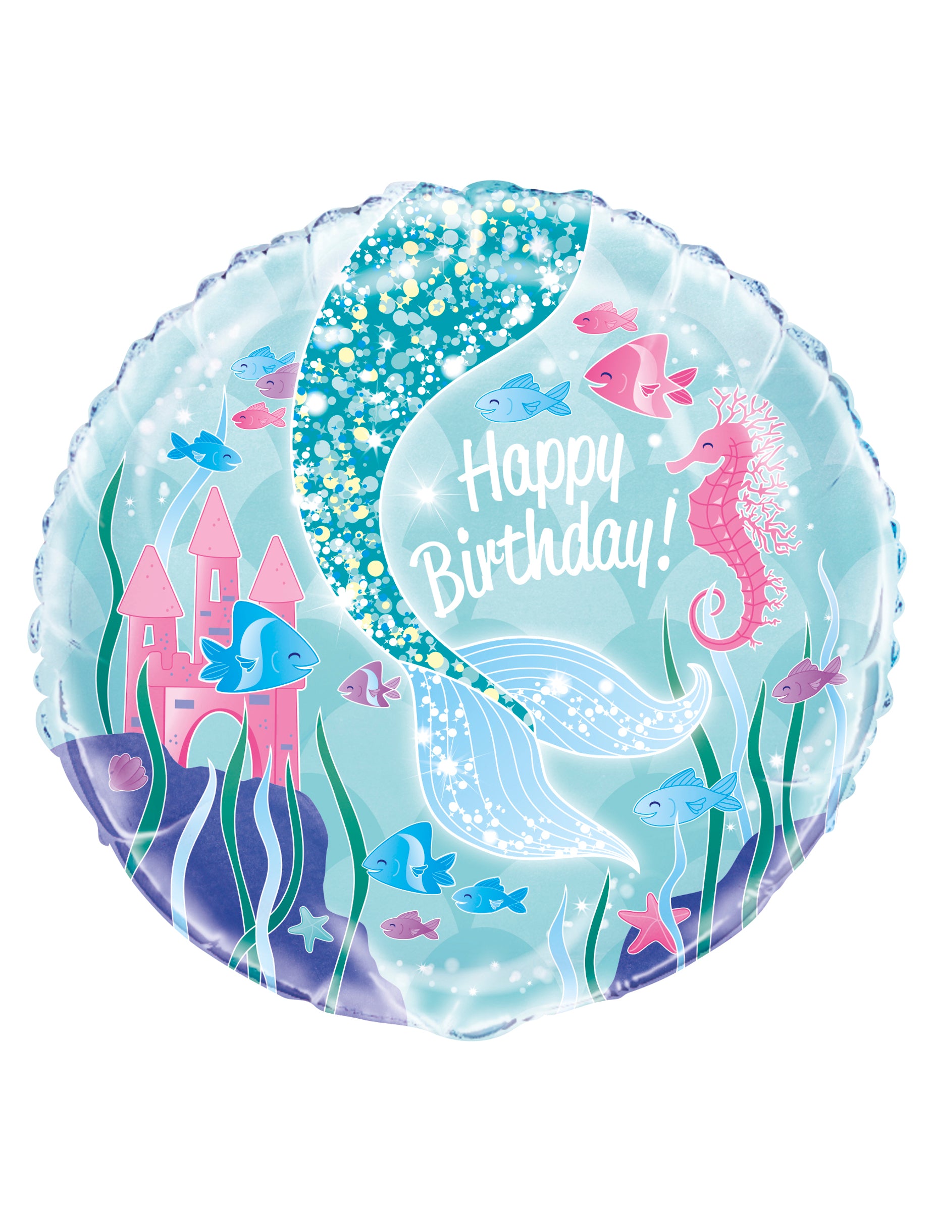 Cu o dimensiune de 45,7 cm, Acest balon de aluminiu va adăuga o notă de magie evenimentului tău. Se umflă ușor cu heliu sau aer folosind un pai. Ilustrația sa acvatică în nuanțe de albastru dezvăluie o coadă de sirenă strălucind în fața unui castel roz Magic. Asta minge este perfect pentru a sărbătoriziua de naștere a unei fetițe care este fană a sirene.