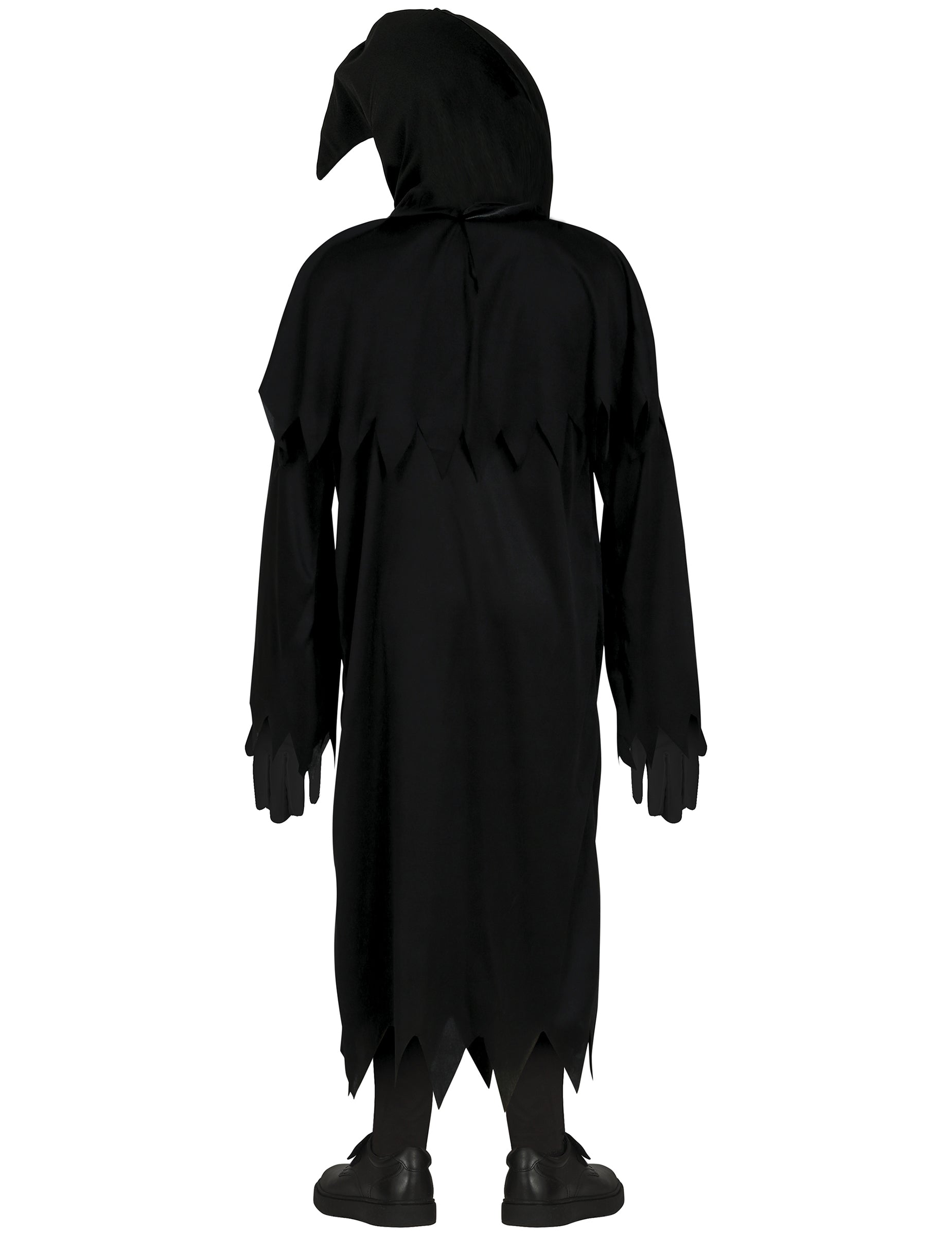 Acest costum de cosit al întunericului este destinat copiilor. Are o tunică și o capotă cu capotă integrată (false, mănuși și chausssures nu sunt incluse). Tunica complet neagră este servită la capătul brațelor și picioarelor. Mânecile lungi sunt evazate pentru a rămâne credincioși acestei întruchipare terifiantă a morții! Pe tunică vine să pună o capotă care este închisă pe față, pentru a nu -ți lăsa copilul să apară. Materialul este transparent pentru a asigura o vizibilitate bună. Această capotă cade, de asemenea, din nou în punctul de pe piept și înapoi, pentru a nu lăsa nimic din corpul copilului tău.