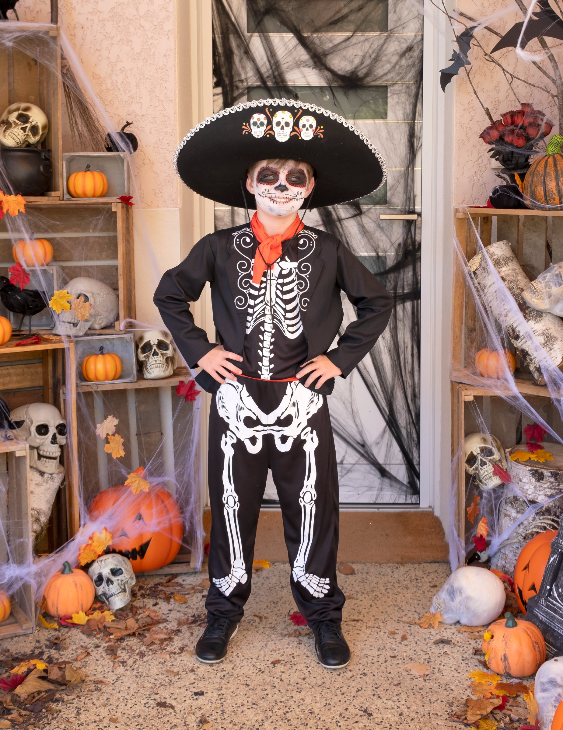 Acest costum de schelet al scheletului Dia de los Muertos este alcătuit dintr -o bandană, o combinație, o jachetă și o centură. Geaca neagră este decorată cu imprimeuri albe pe față. Bandana roșie se potrivește cu centura pentru a fi legată la talie. Optați pentru acest costum de schelet schelet din Los Muertos pentru Boy pentru Halloween.