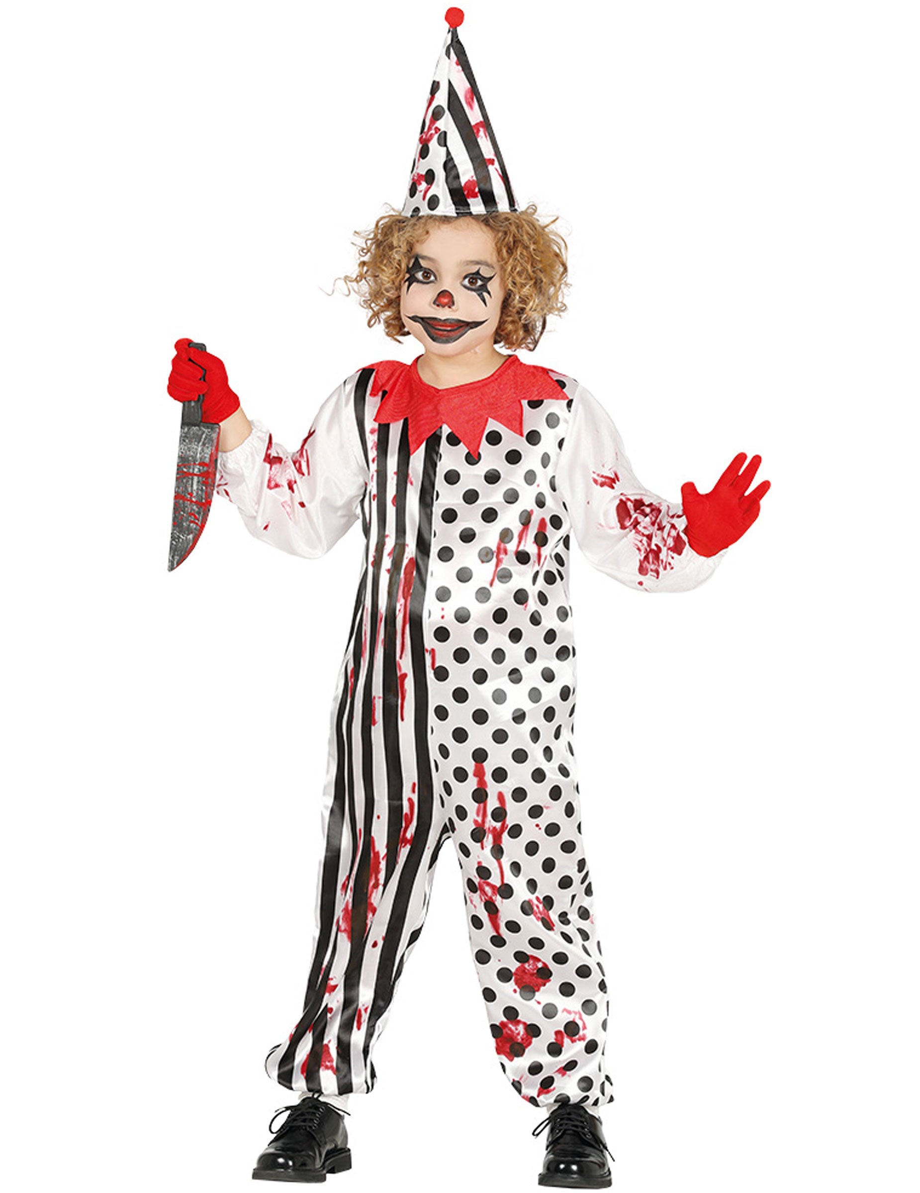 Acest costum de zombie Arlequin pentru copii este alcătuit dintr -o pălărie și o combinație (mănuși, cuțit și încălțăminte nu sunt incluse). Combinația de clovn este cu mâneci lungi albe. O parte este în dungi, iar cealaltă cu puncte polka alb -negru. Un guler roșu seruit împodobește combinația plăcută de purtat. În ceea ce privește pălăria ascuțită, se potrivește cu combinația și finalizată de un pompom roșu. Întreaga ținută este pătată de sânge. Acest costum sângeros de zombie fără sânge pentru copii este ideal pentru deghizare înfricoșătoare de Halloween!