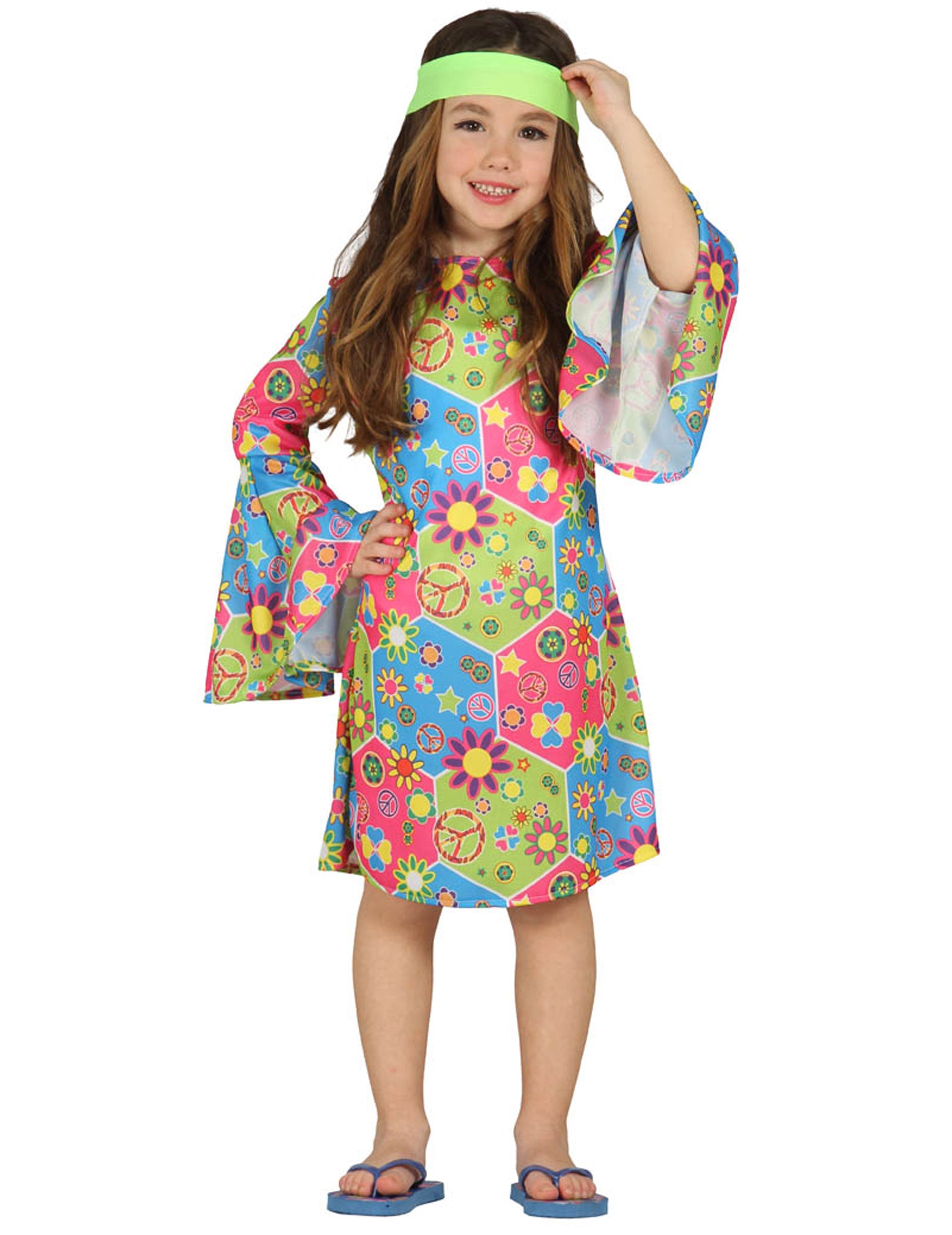 Acest costum de hippie pentru fată este compus dintr-o bandană și o rochie.