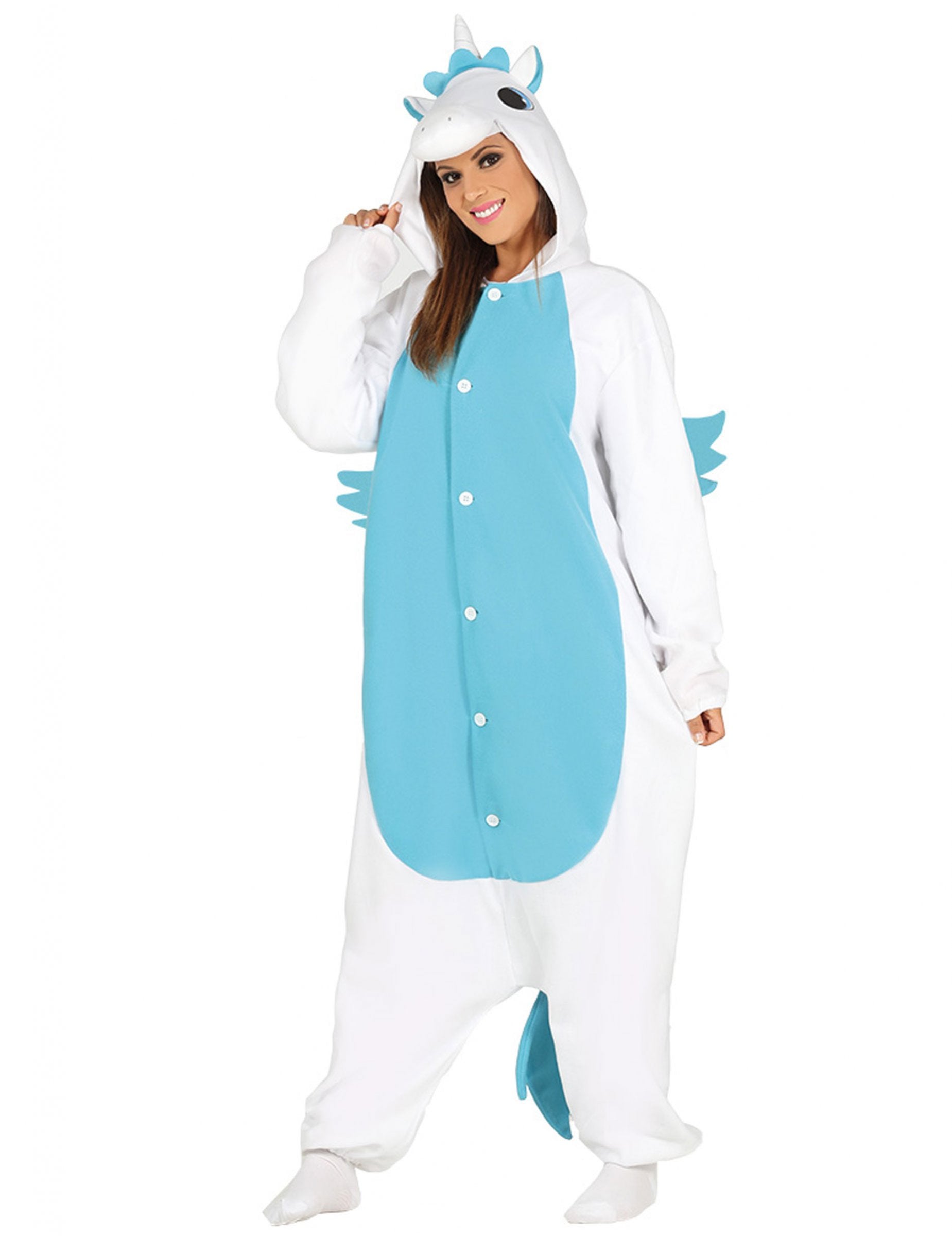 Această deghizare a unicornului pentru adulți este formată dintr -o combinație mare cu glugă. Combinația de culori albe cu o burtă albastră se închide cu butoane din față. O coadă lungă cu părul albastru. Hota reprezintă capul unui unicorn cu ochi mari albaștri. Acest costum va fi perfect pentru carnaval.