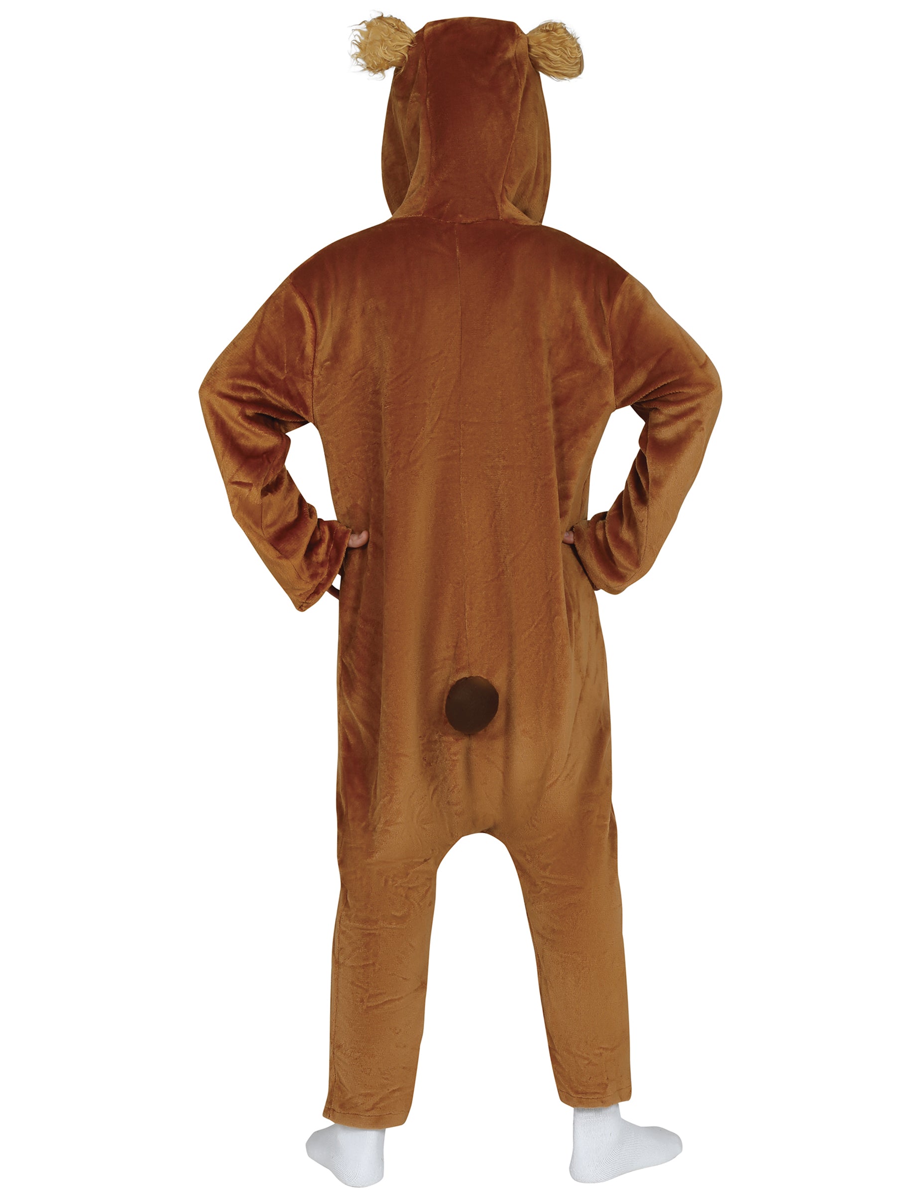 Acest costum de urs brun este destinat adulților. Este format dintr -o combinație care se închide folosind un fermoar pe față. Reprezintă un urs într -o blană cu aspect de stomac, făcută dintr -o țesătură de pluș. Această combinație maro are o capotă reprezentând chipul unui urs cu urechile de pluș. Această deghizare a ursului va fi perfectă pentru carnaval sau pentru o seară pe tema animalelor.