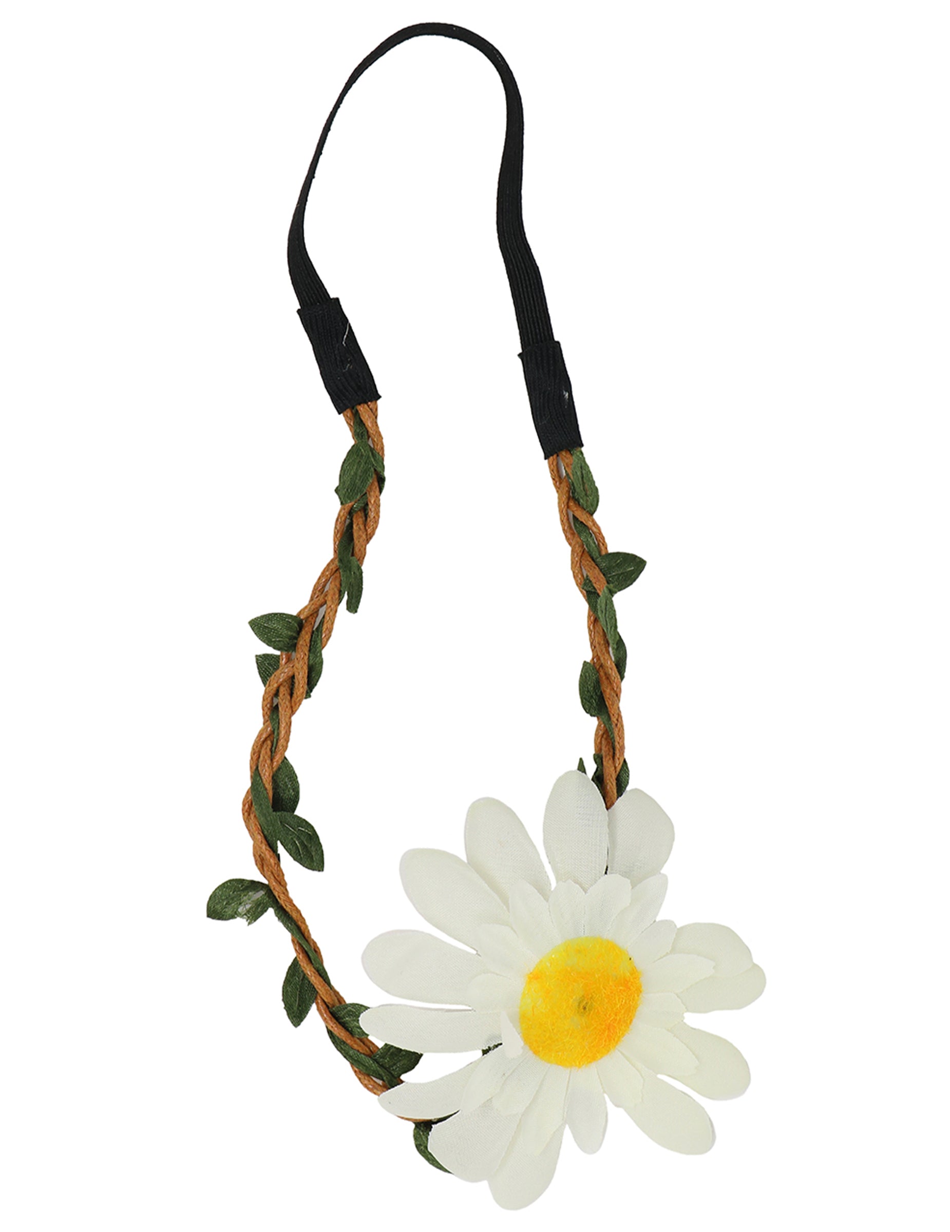Acest tur de cap, vândut singur, este destinat adulților. Acest turn de cap este în imitație din piele împletită de culoare de culoare cămile. Este decorat cu o margaretă falsă mare, cu petale albe și centrul galben. Acest tur principal, care face parte dintr -un stil chic boem va fi accesoriul elegant al diferitelor costume hippie sau boem pentru un carnaval sau o seară deghizată.