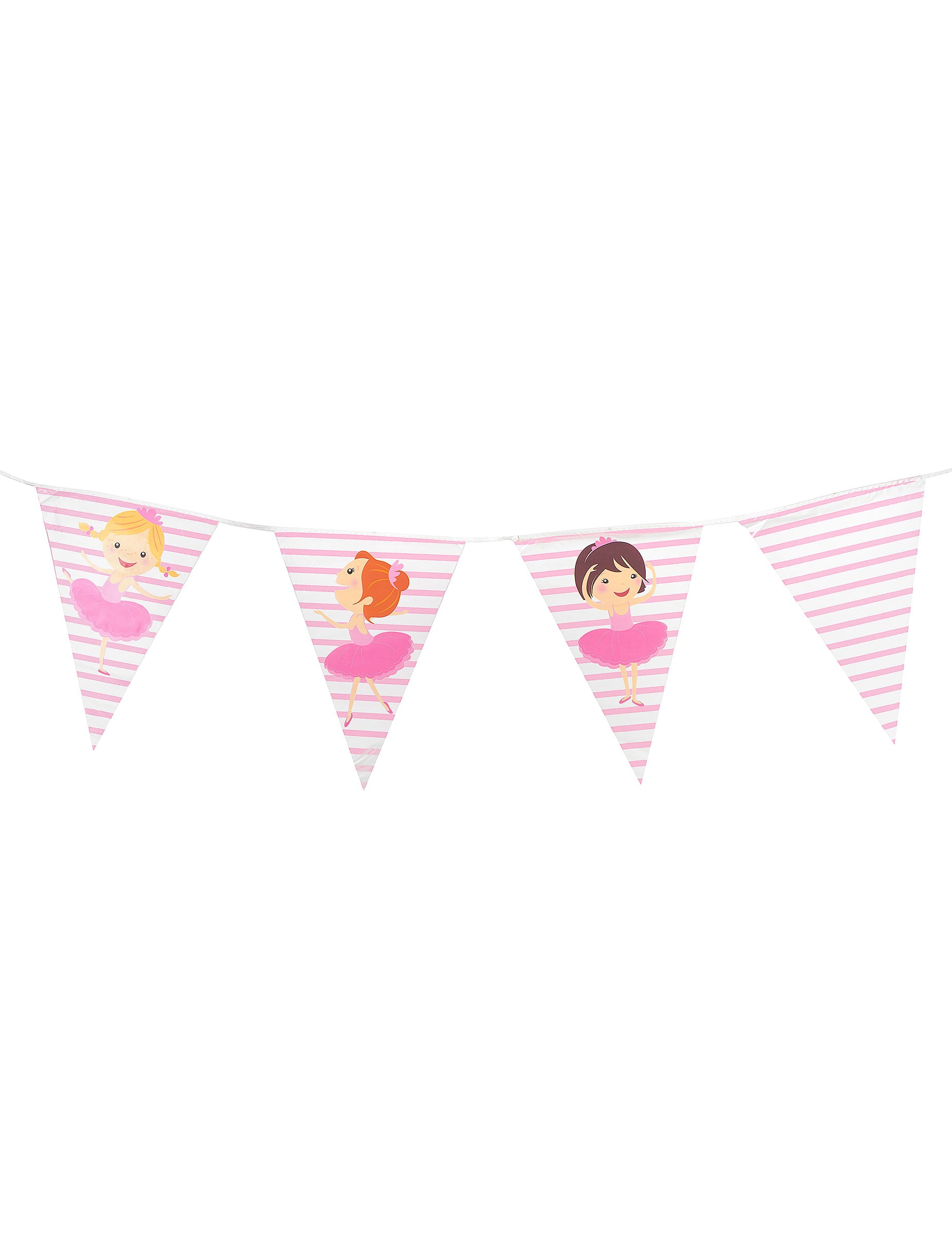 Această ghirlandă fină din plastic este formată din pennante triunghiulare. Are o lungime totală de aproximativ 270 cm și poate fi suspendat cu ușurință. Pennanții sunt decorați cu dungi roz pal, precum și mici balerine în mijlocul unui spectacol de dans. Această ghirlandă va fi perfectă pentru a vă decora camera de ziua de naștere a fetei tale clasice de dans!