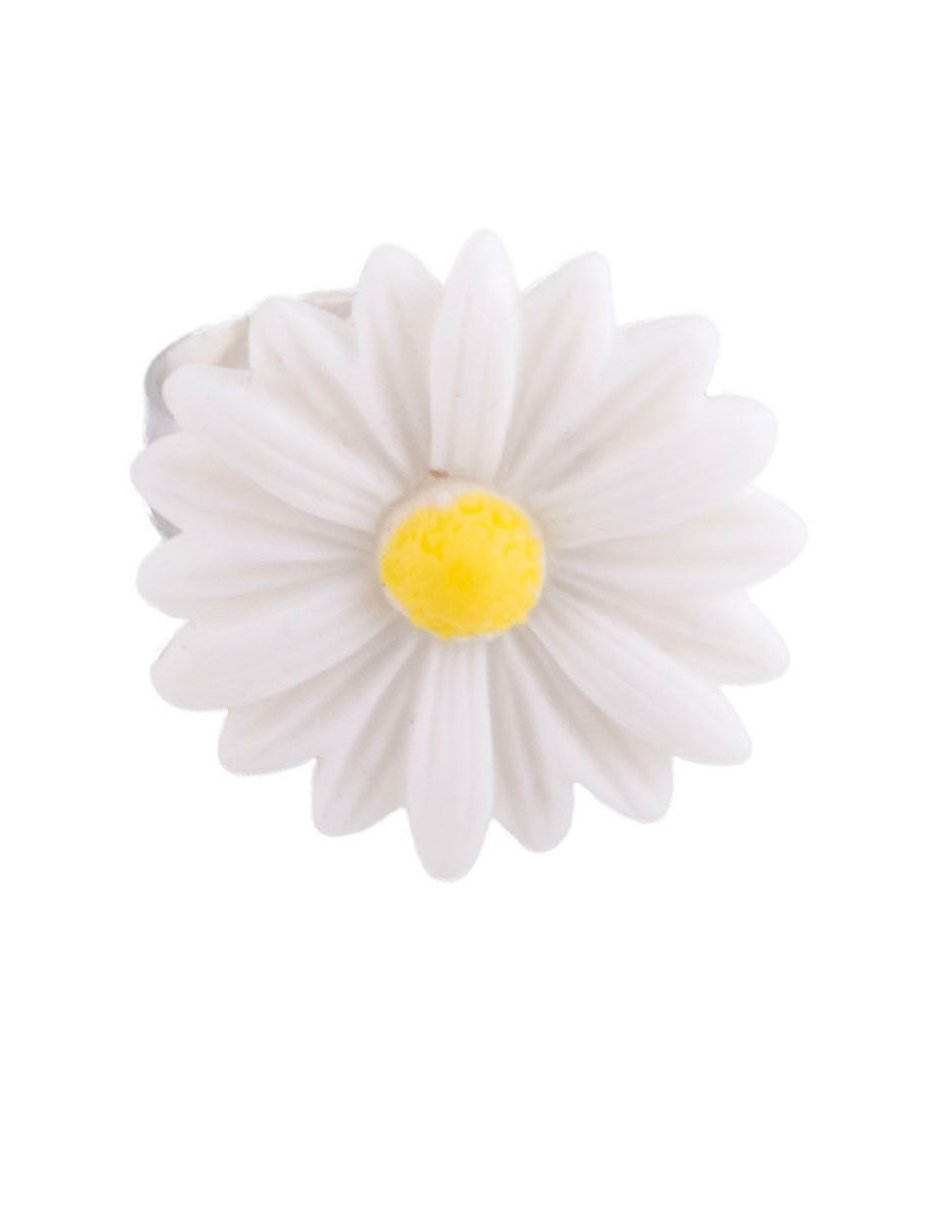 Acest inel pentru adulți este decorat cu o margarete de plastic alb și cu o inimă galbenă. Inelul este argintiu. Cu această bijuterie puteți completa un costum prințesă de flori sau hippie bucolică pentru următorul carnaval.
