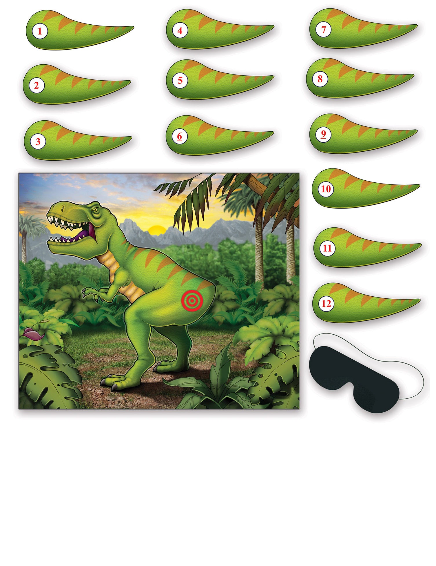 Acest set de joc este format dintr -un poster și 12 cozi și 1 mască inclusă. Acest afiș este pe tema dinozaurilor. Măsoară aproximativ 56 cm lățime x 46 cm înălțime. Scopul jocului este de a pune masca și de a plasa coada dinozaurului în locația planificată. Această animație va fi perfectă pentru o gustare de naștere sau o petrecere pe tema dinozaurilor!