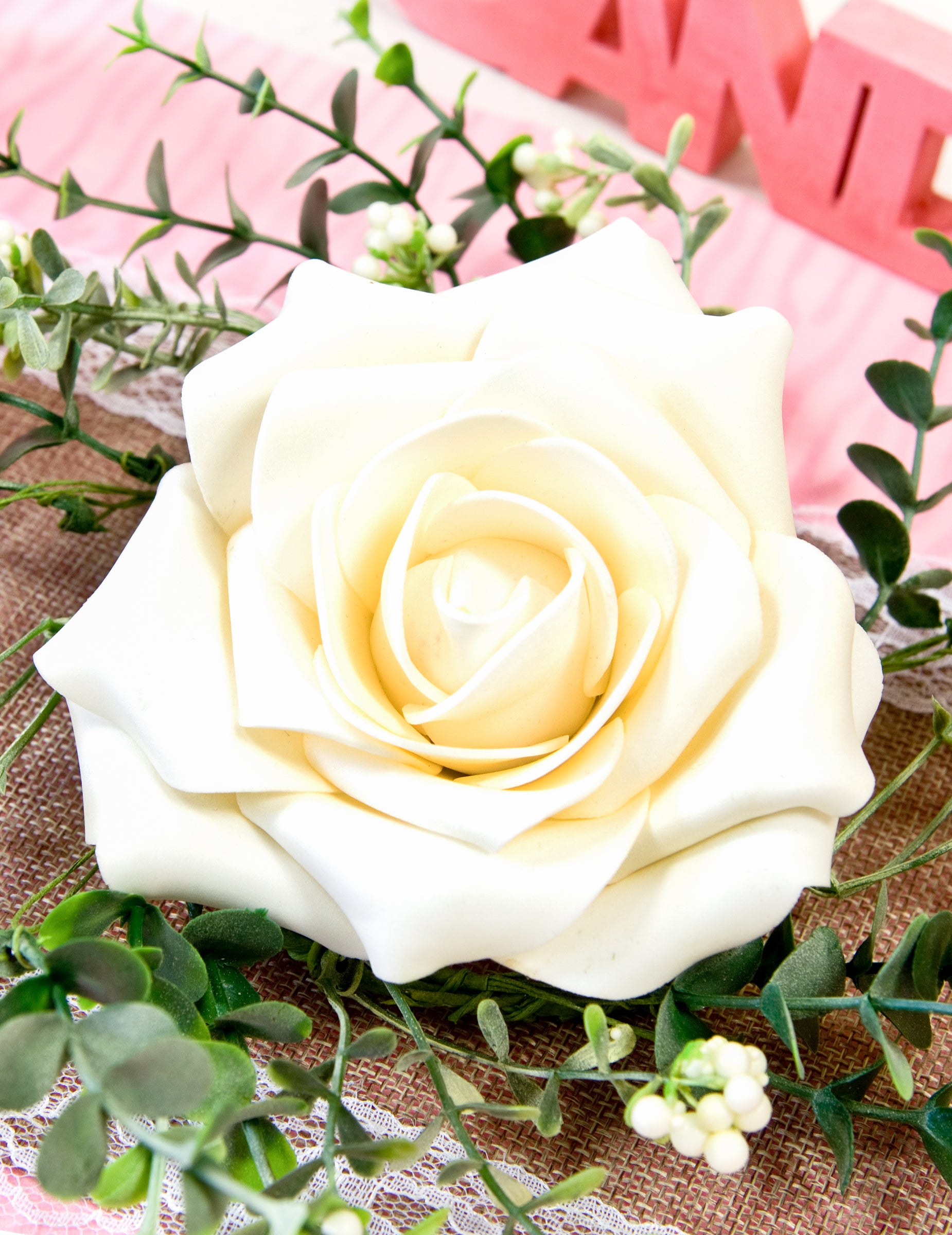 Apportez une touche d'élégance à votre réception avec ce centre de table de 18 cm de diamètre. Composé d'une rose ivoire centrale, cet arrangement est agrémenté de petits fleurons blancs et de feuilles synthétiques vertes. Cette fleur artificielle est l'accessoire parfait pour créer une ambiance à la fois champêtre et classe lors de votre mariage ou de tout autre événement festif.