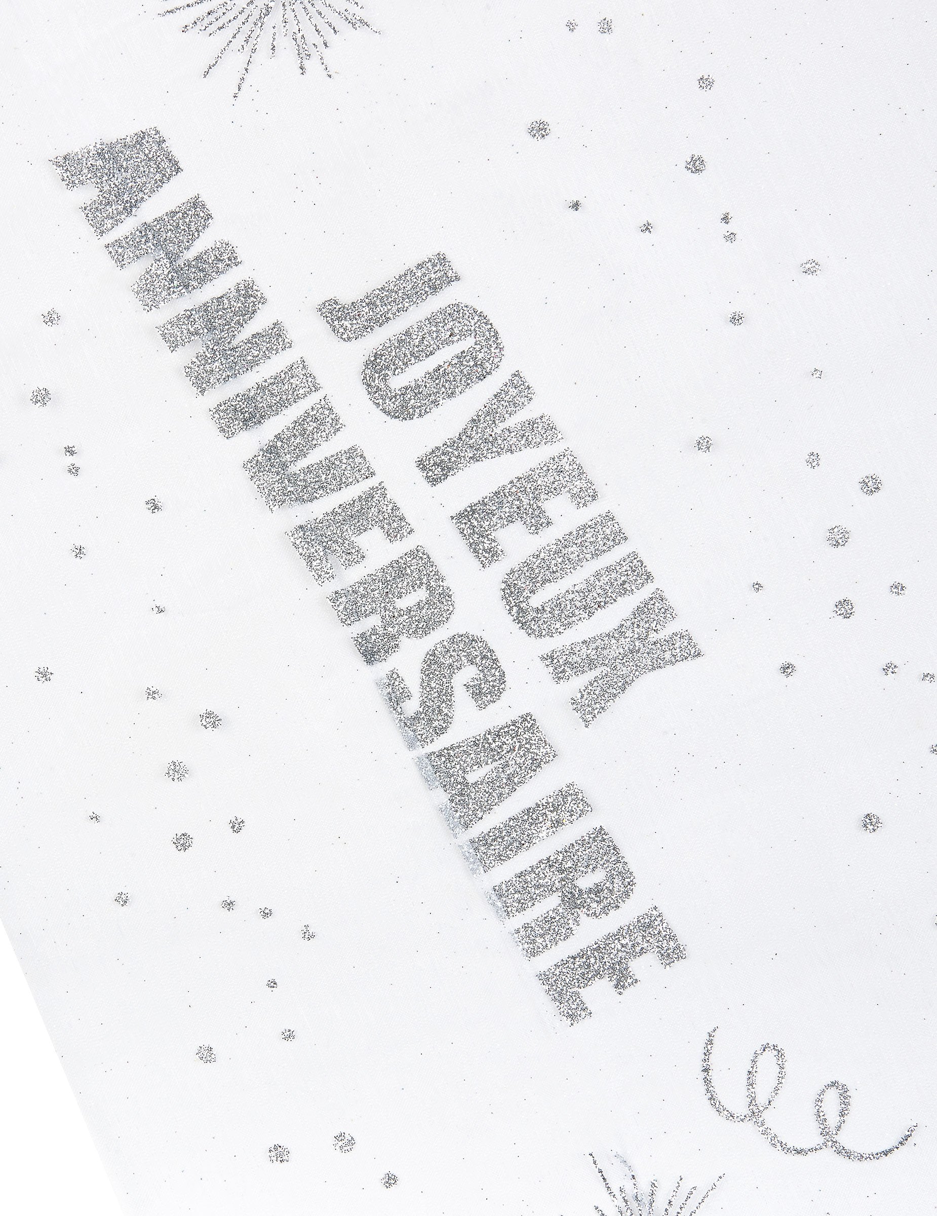 Îmbunătățiți-vă recepția cu asta alergător de masă Design elegant din organza. Iese în evidență prin mesajul său „ La mulți ani „scris cu litere argintii strălucitoare. Cu dimensiunile sale de 29 cm Vândut în role de 5 m, acest material se adaptează la toate suprafețele, deoarece îl puteți tăia la dimensiunea dorită. Va deveni piesa centrală fermecătoare a aranjamentului dumneavoastră. decorarea mesei să sărbătorim petrecere de ziua de naștere.