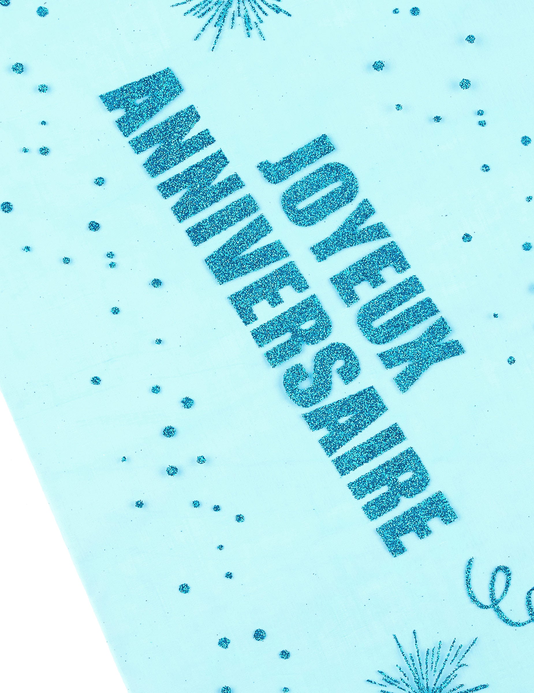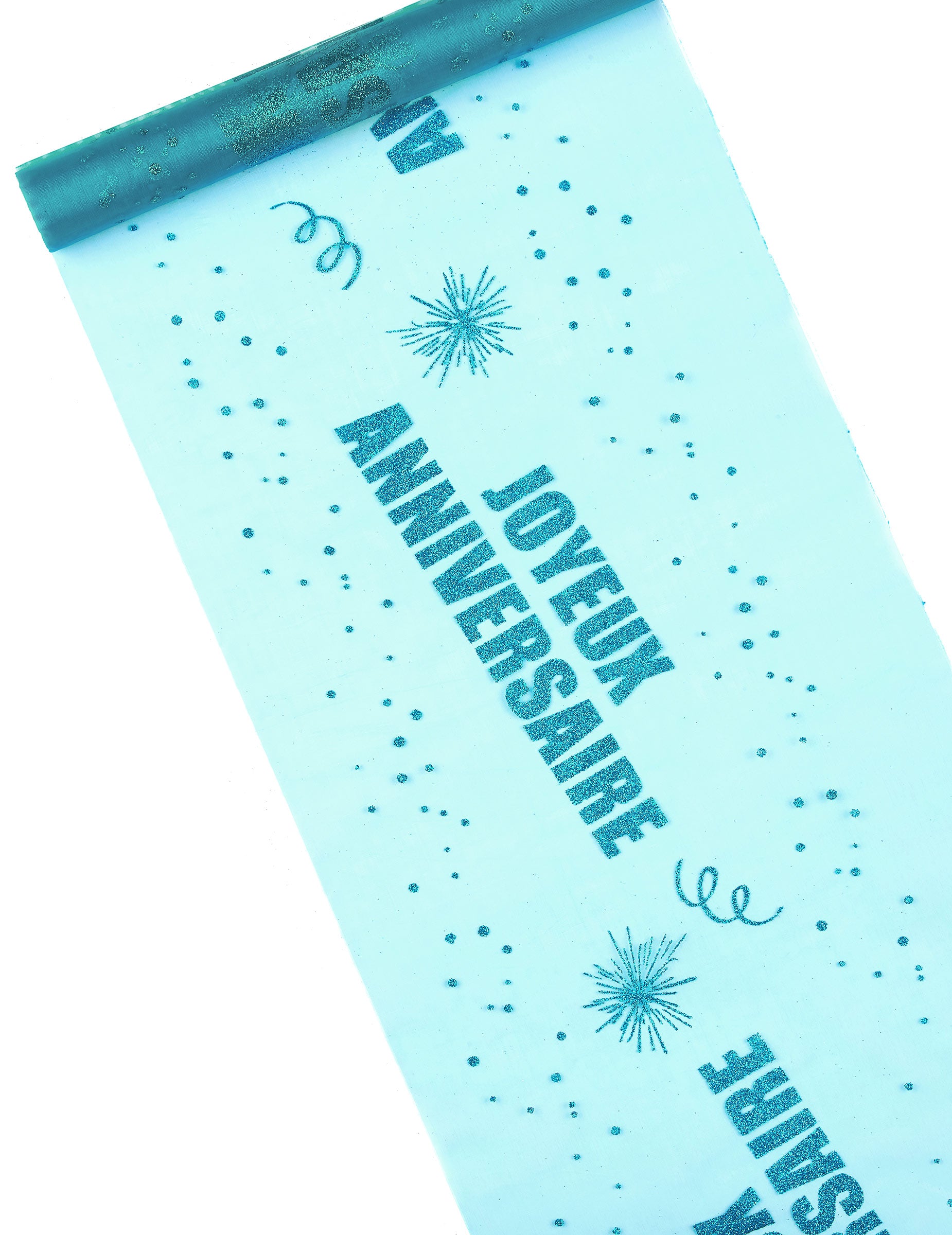 Conçu en organza bleu turquoise, il s'orne de motifs festifs et du message « joyeux anniversaire » scintillant en paillettes bleues. Sa matière souple permet une découpe personnalisée selon vos besoins pour s'adapter parfaitement à votre mobilier.