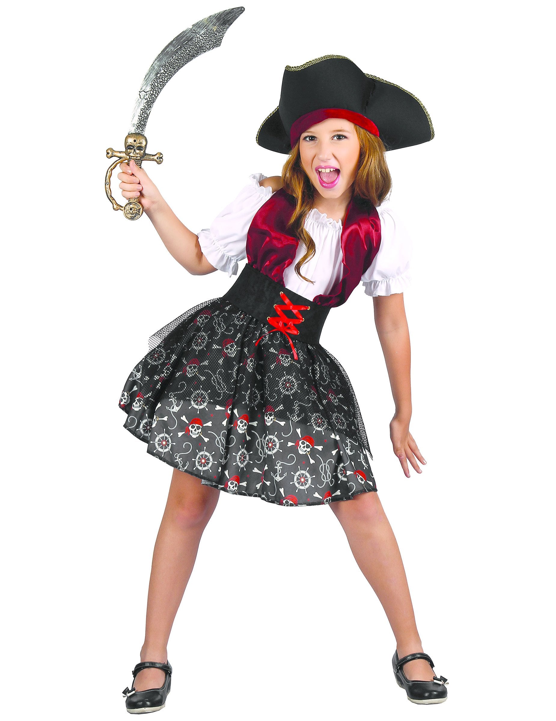 Această deghizare pirat pentru fată include o rochie, o centură și o pălărie (sabia și pantofii nu sunt incluse). Rochia are un craniu foarte frumos și un imprimeu cu bar pentru pirați. Ea intră în evacuare. Setul este cu mâneci scurte și pufoase, o centură de pâslă neagră cu o dantelă roșie falsă trebuie poziționată la talie. Pălăria de spumă flexibilă este neagră pe o margine roșie și are un suport superb. Acest costum pirat pirat este ideal pentru a intra în pantofii unui pirat destul de frumos în timpul unui eveniment deghizat, cum ar fi carnavalul sau ziua de naștere tematică.
