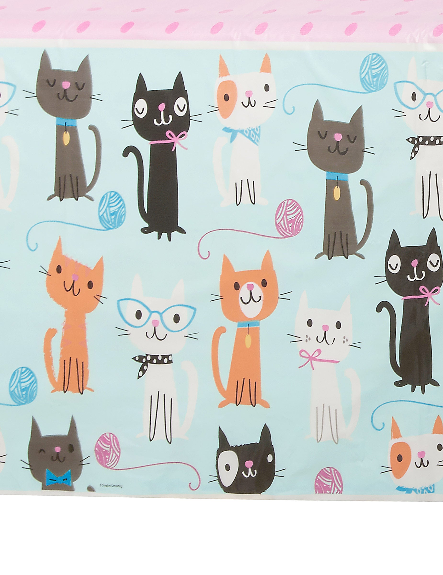 Cu dimensiuni de aproximativ 137 x 259 cm, acest față de masă Este fabricat din plastic rezistent. Prezintă un design festiv cu buline roz, decorat cu mici... pisici Copii albi, gri și roșii care se joacă cu gheme de lână pe un fundal albastru. Această protecție de masă va fi perfectă pentru a crea o atmosferă veselă în timpul...ziua de naștere al copilului dumneavoastră.
