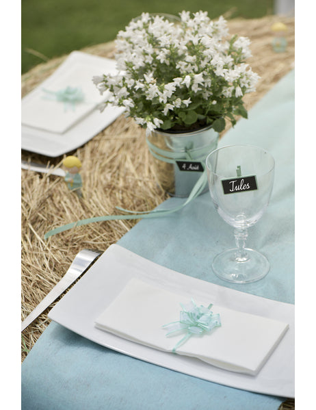 Ce lot contient 5 minis nœuds turquoise élégants pour vos festivités. Conçus en organdi satiné d'un bleu éclatant, ces petits nœuds sont fabriqués à partir d'un ruban de 16 mm de largeur. La mise en forme est très simple : il suffit de tirer sur les deux cordelettes au dos, ce qui permet aussi de les fixer facilement sur vos supports. Ces accessoires sont parfaits pour embellir une table, des contenants à dragées ou servir de ronds de serviette originaux. Apportez une touche de légèreté à votre décoration de mariage ou de baptême avec ces délicats ornements en organdi.