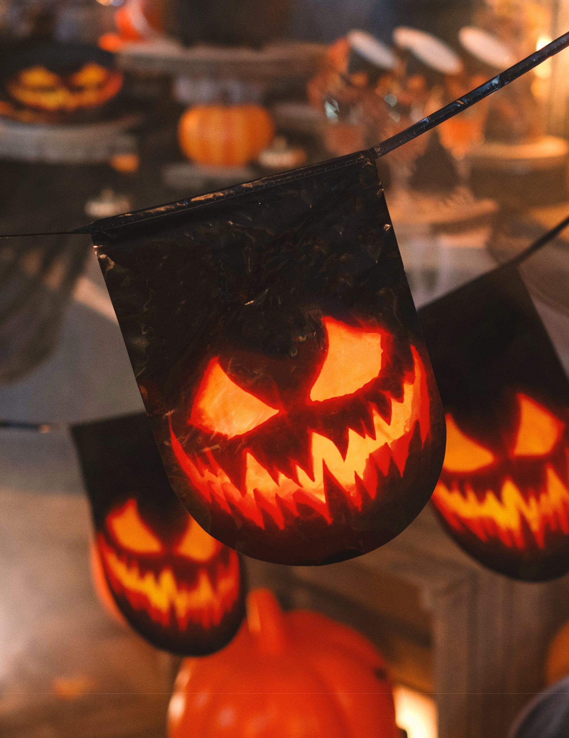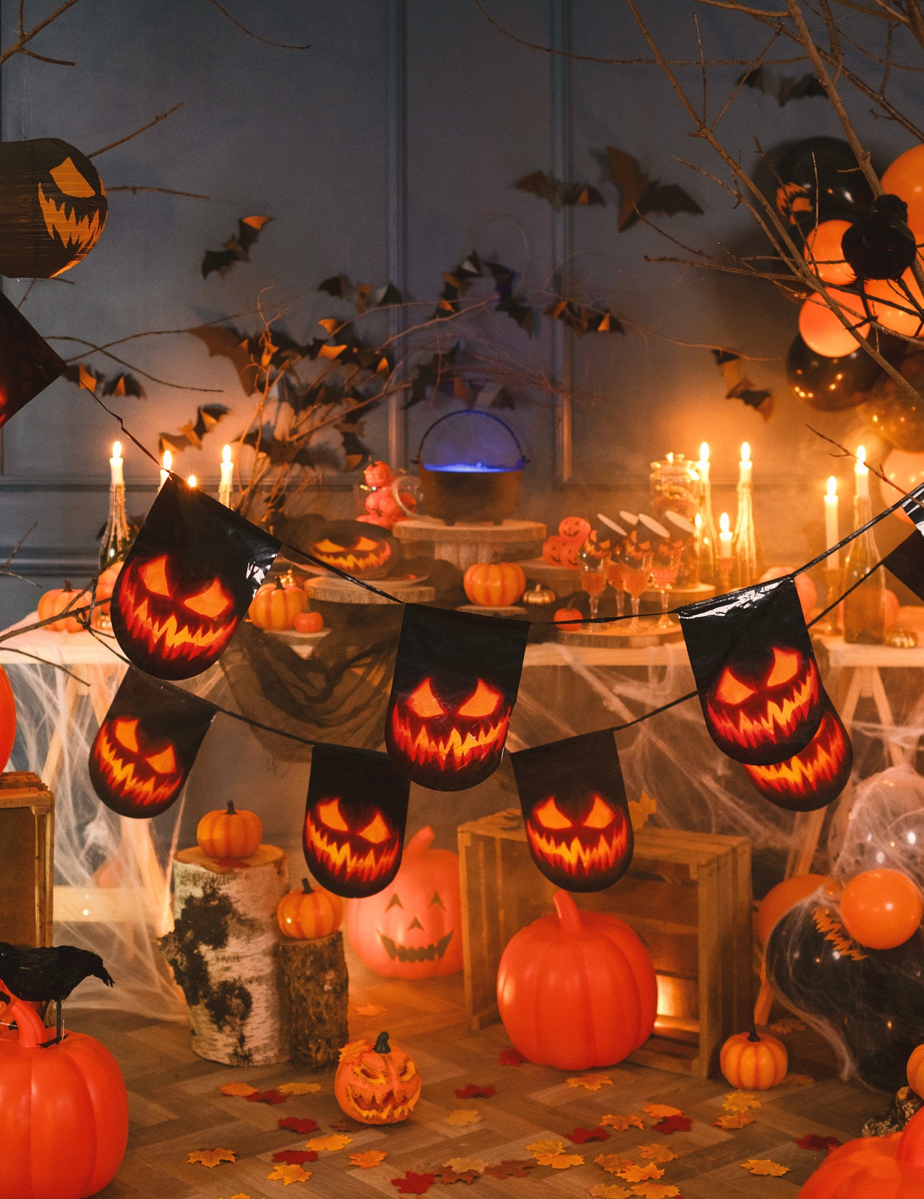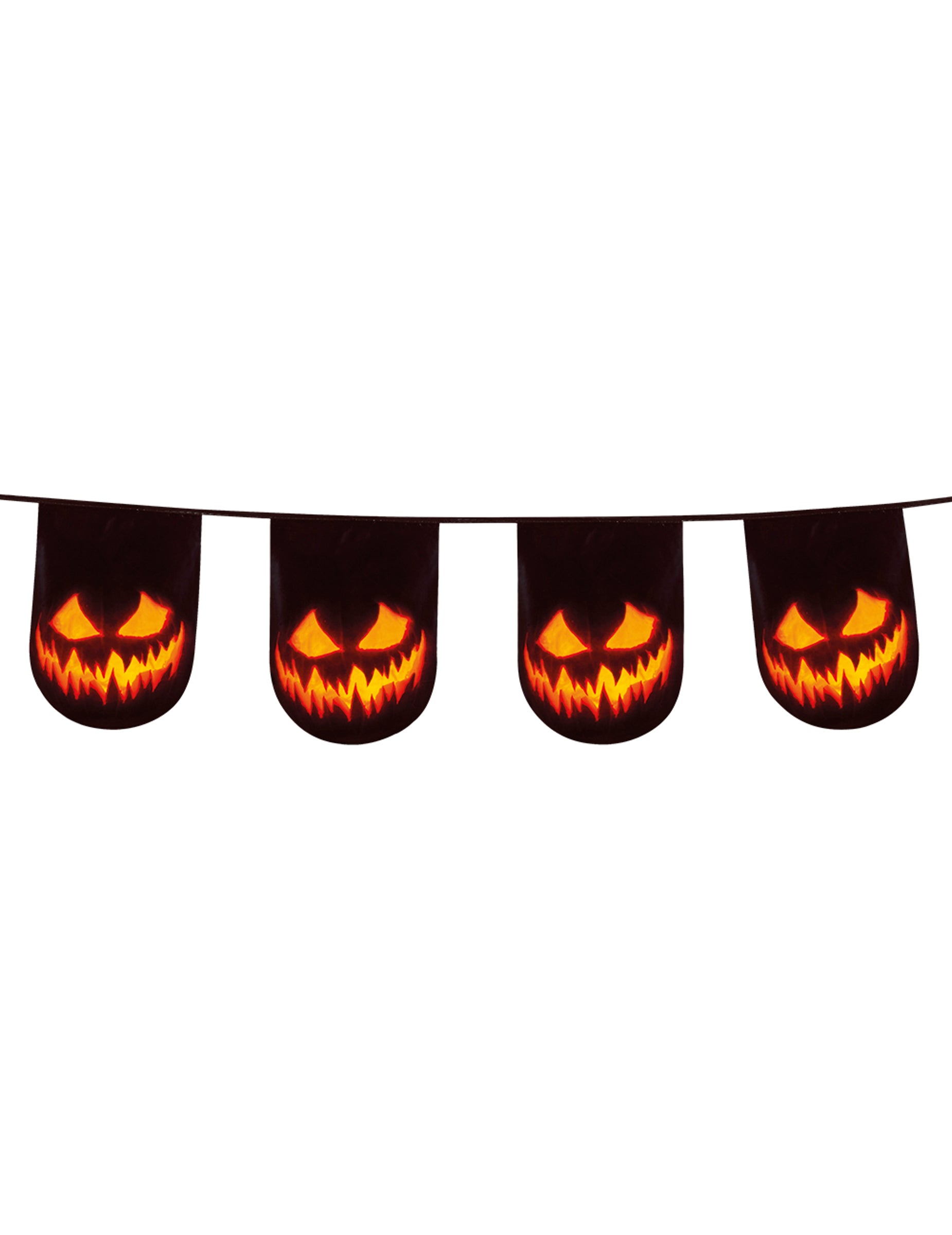 Alcătuit din pennanți cu un fundal negru ilustrat cu dovleci cu zâmbete malefice, această ghirlandă de 6 m aduce imediat un efect izbitor de Halloween. Agățați -vă cu ușurință în interior sau în aer liber, vă permite să evidențiați o intrare sau să încadrați o zonă de petrecere cu intensitate. Ideal pentru completarea unui cadru care arată ca un coșmar festiv.