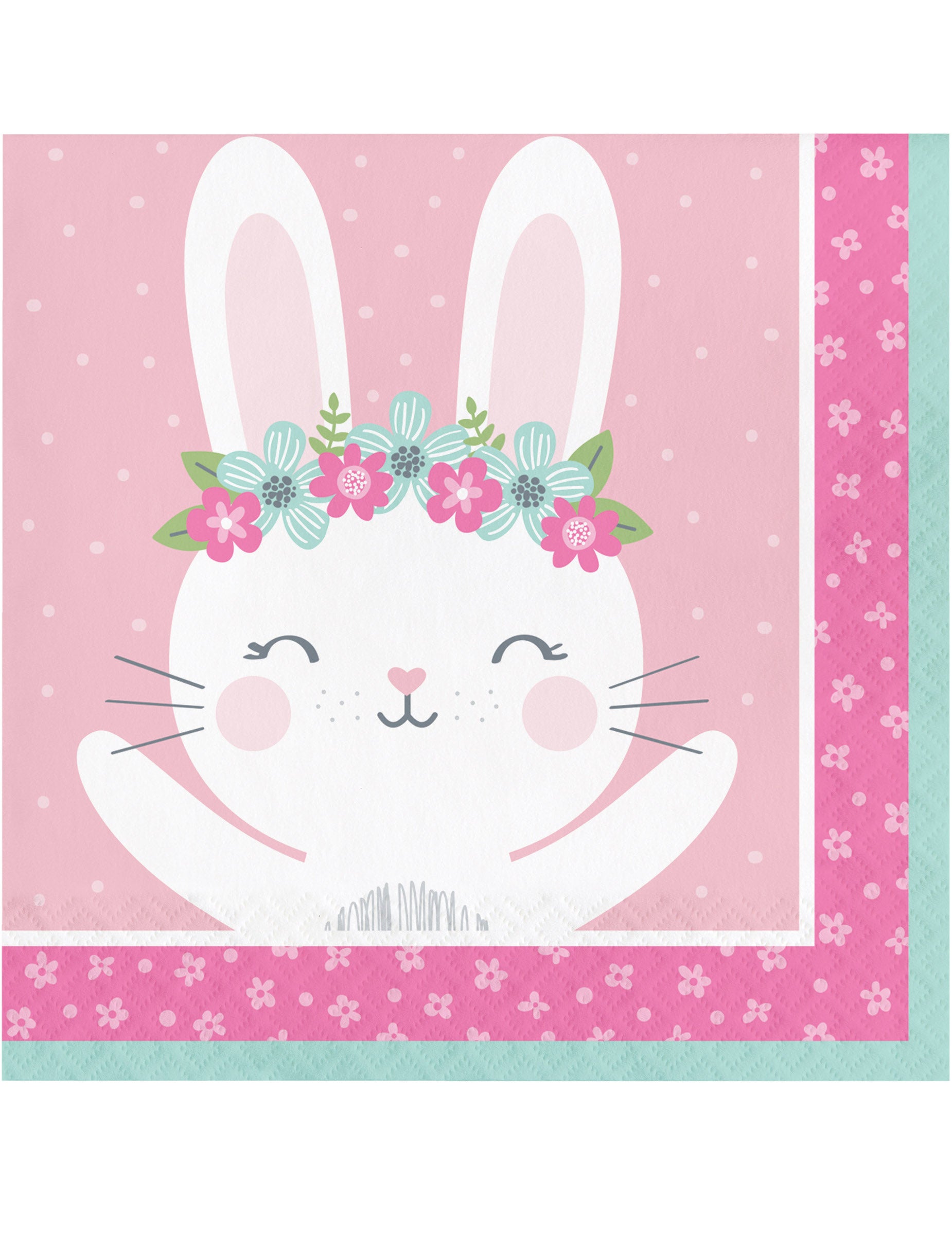 Ce lot comprend 16 serviettes en papier aux motifs printaniers. Elles affichent des dimensions de 16,5 x 16,5 cm en format plié et 33 x 33 cm lorsqu'elles sont totalement dépliées. Le design met en avant un fond rose délicat entouré de fleurs blanches et d'un cadre vert. Au centre, un mignon petit lapin blanc avec une couronne fleurie apporte une note de tendresse. Ces serviettes jetables seront l'accessoire indispensable pour décorer un anniversaire ou une fête pour enfants.