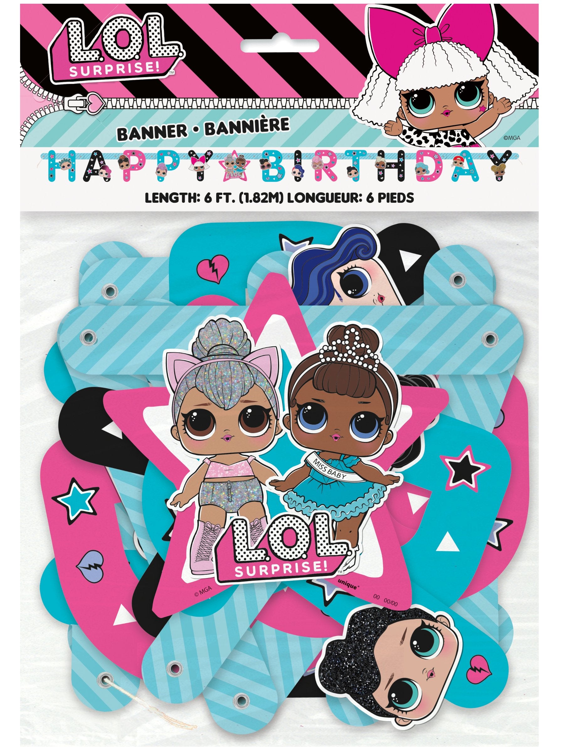 Acest Garland de ziua de naștere din carton este sub licență oficială lol surpriză. Este format din scrisori de carton care formează mesge -ul „La mulți ani”. Aceste scrisori sunt tipărite LOL Surprise Dolls. Garland măsoară aproximativ 1,69 metri lungime. Ea se va completa pentru a -ți încânta decorul de ziua de naștere pe tema păpușilor preferate a fiicei tale! Petrecere unică de branding.