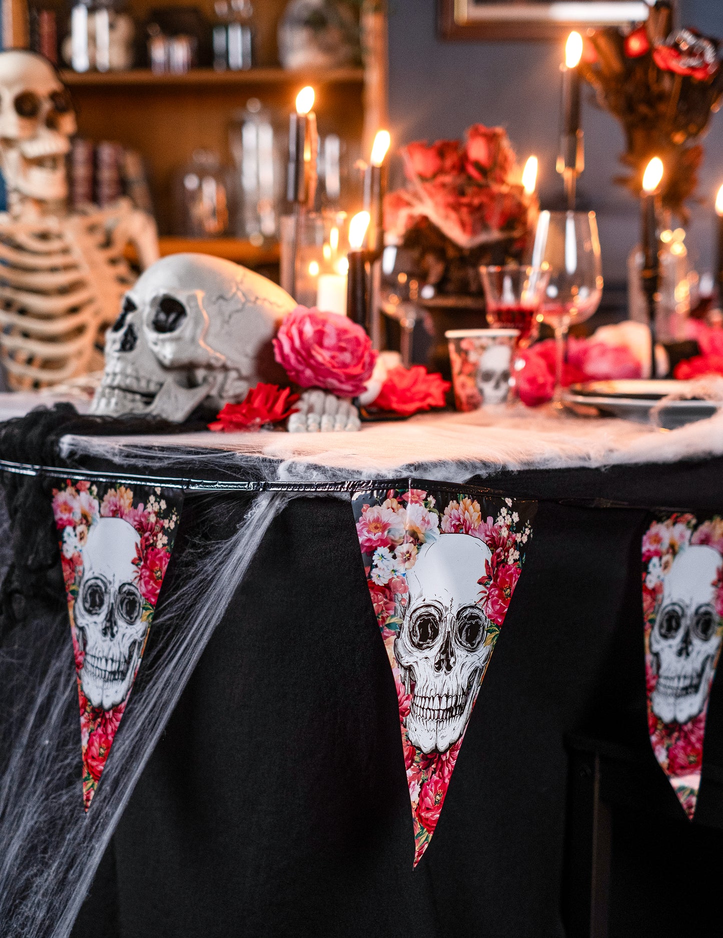 Acest plan planifică ghirlanda este din plastic. Are o lungime de aproximativ 6 m și pennante de aproximativ 30 cm înălțime. Este negru cu cranii de schelet înconjurat de flori roz imprimate pe el. Această ghirlandă va fi perfectă pentru decorarea camerei tale de Halloween!