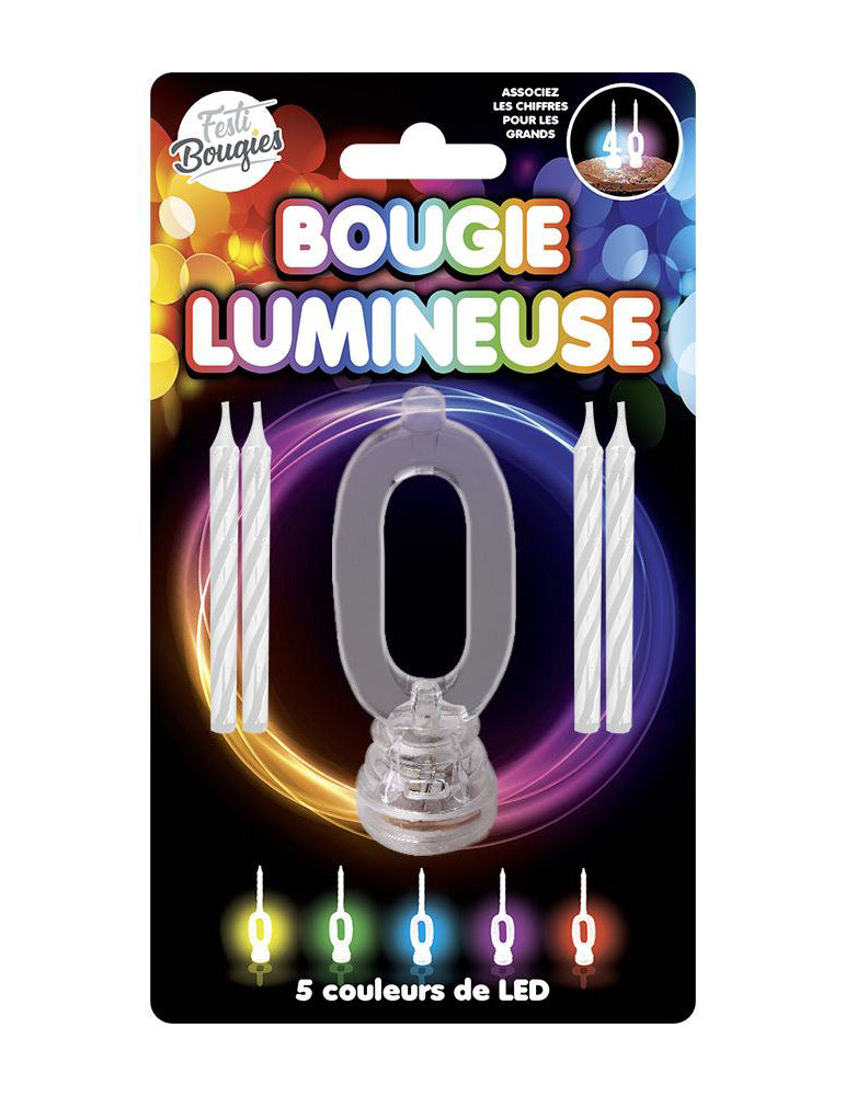 Acest lot este format din 1 suport și 4 lumânări de ceară. Suportul este luminos și reînnoiește numărul 0, poate aprinde 5 culori diferite (galben, verde, albastru, roz și roșu). Cele 4 lumânări sunt lumânări clasice pe care le puteți plasa pe sprijin. Această lumânare strălucitoare va fi ideală pentru a aduce o notă de culoare originală la tortul tău de ziua ta!