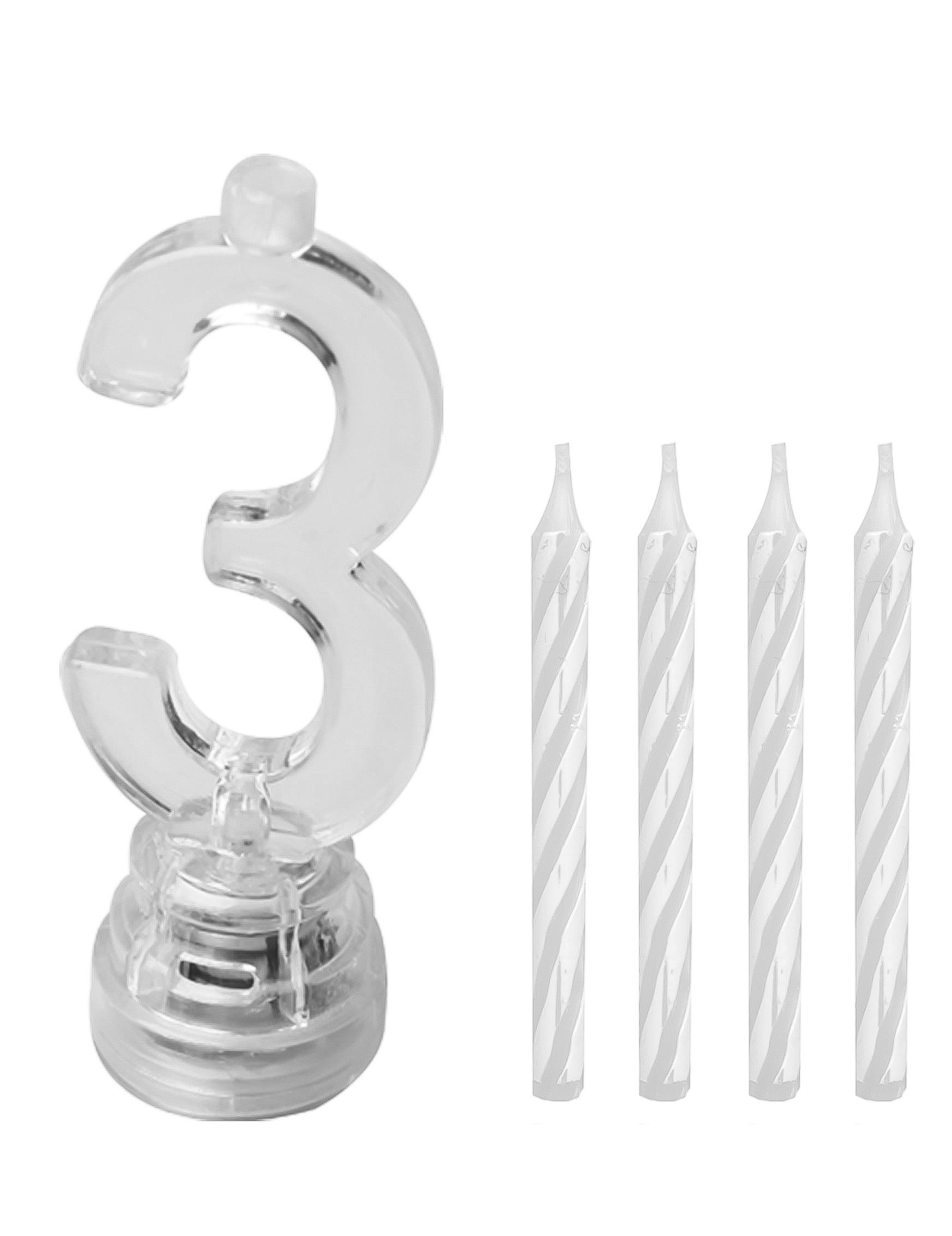 Acest lot este format dintr -o bază de plastic și 4 lumânări albe. Baza reprezintă numărul 3 transparent care se aprinde cu diferite culori de LED: verde, albastru, roz, galben și roșu. Are o locație de mai sus pentru a pune o lumânare. Cele 4 lumânări de ceară pot fi așezate cu ușurință pe bază. Afișează -ți vârsta strălucitoare pe tortul tău de naștere cu aceste lumânări!