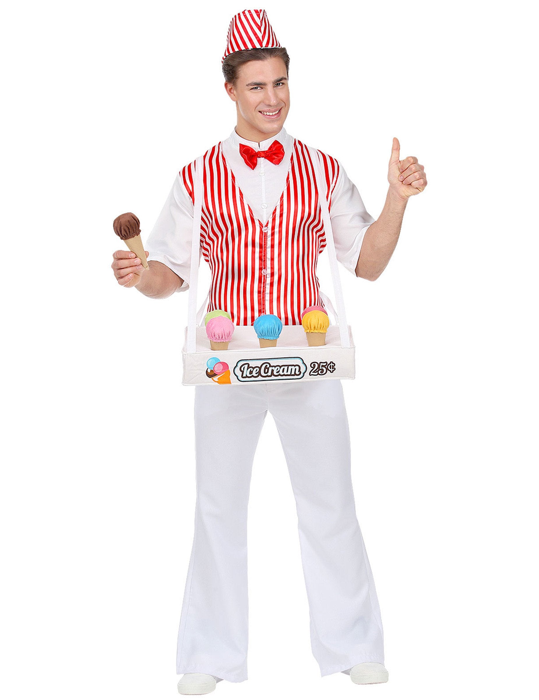 Crema de cremă a vânzătorului de costume este destinată bărbaților, este formată dintr -o cămașă cu vestă, un papion, o pălărie și o tavă conică cu 6 conuri de înghețată. Cămașa este albă, cu o dungi false albe și roșii și cu cosuri false transparente pe față. Red se găsește și pe nodul fluturelui într -un mod unit și pe pălărie, de asemenea, cu dungi albe și roșii care se conectează la vesta falsă. O tavă conică cu 6 conuri de înghețată este furnizată pentru a accesoriza perfect costumul. Acest vânzător de înghețată va fi ideal pentru un eveniment deghizat.