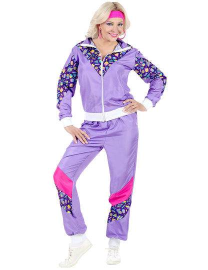 Acest costum din anii 80 pentru femei este format dintr -o geacă și pantaloni (bandă, bucle, radio și pantofi care nu sunt incluse). Geaca de pistă este violet, cu panouri violet închis cu modele. Se închide cu un fermoar pe față. Partea de jos a sacoului și mânecile este mărginită de o fâșie largă de țesătură albă. Pantalonii potriviți sunt violet, cu o fâșie de țesătură modelată la genunchi și o fâșie de țesătură roz. Este listat în glezne. Acest costum retro va fi perfect pentru a participa la o seară de anii 80.