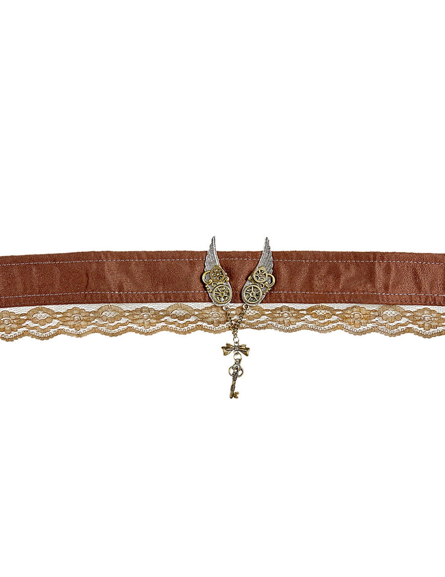 Acest colier steampunk este pentru adulți. Este confecționat din țesătură maro cu dantelă mai clară. În centru există două aripi cu COGS și una care atârnă. Colierul este atașat folosind o zgârietură. Acest colier va fi accesoriul perfect pentru deghizarea steampunk în timpul unui eveniment deghizat.