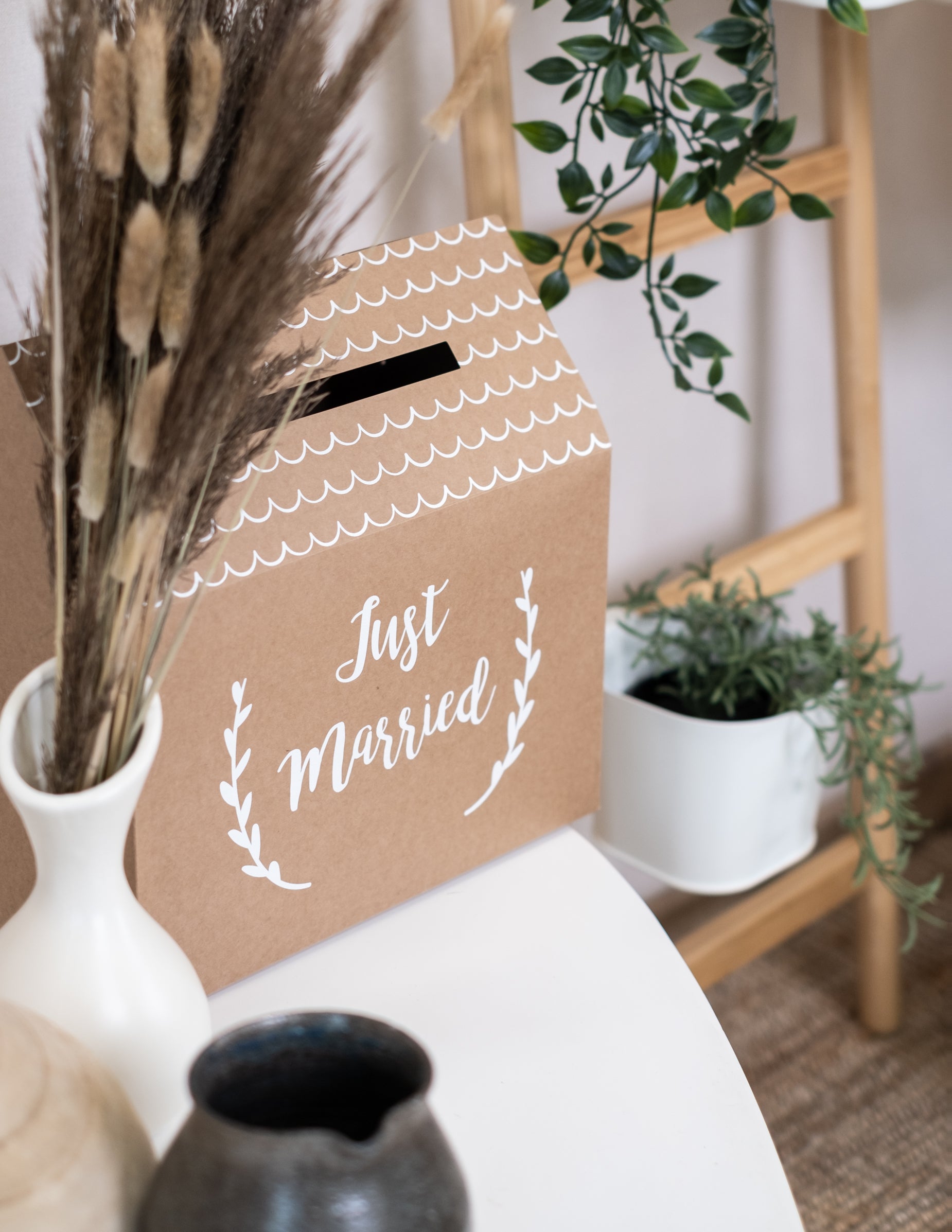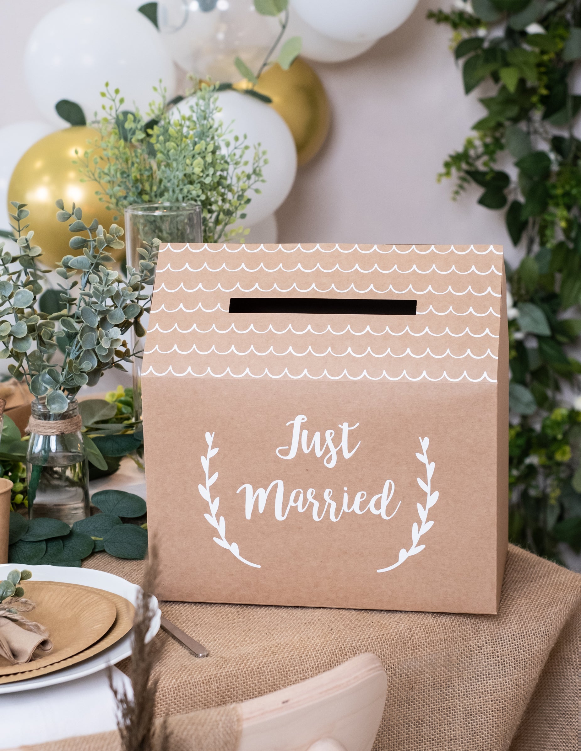 Optez pour cette urne en forme de petite maison pour recueillir les témoignages de vos proches. Fabriquée en carton kraft, elle affiche l'inscription "Just Married" en blanc entourée de délicates branches de laurier. Ses dimensions sont d'environ 30 x 30,5 x 16,5 cm une fois montée. La fente pratique située sur le dessus permet de glisser aisément vos enveloppes et mots doux. Cette urne apportera une note authentique et champêtre à votre décoration de mariage .