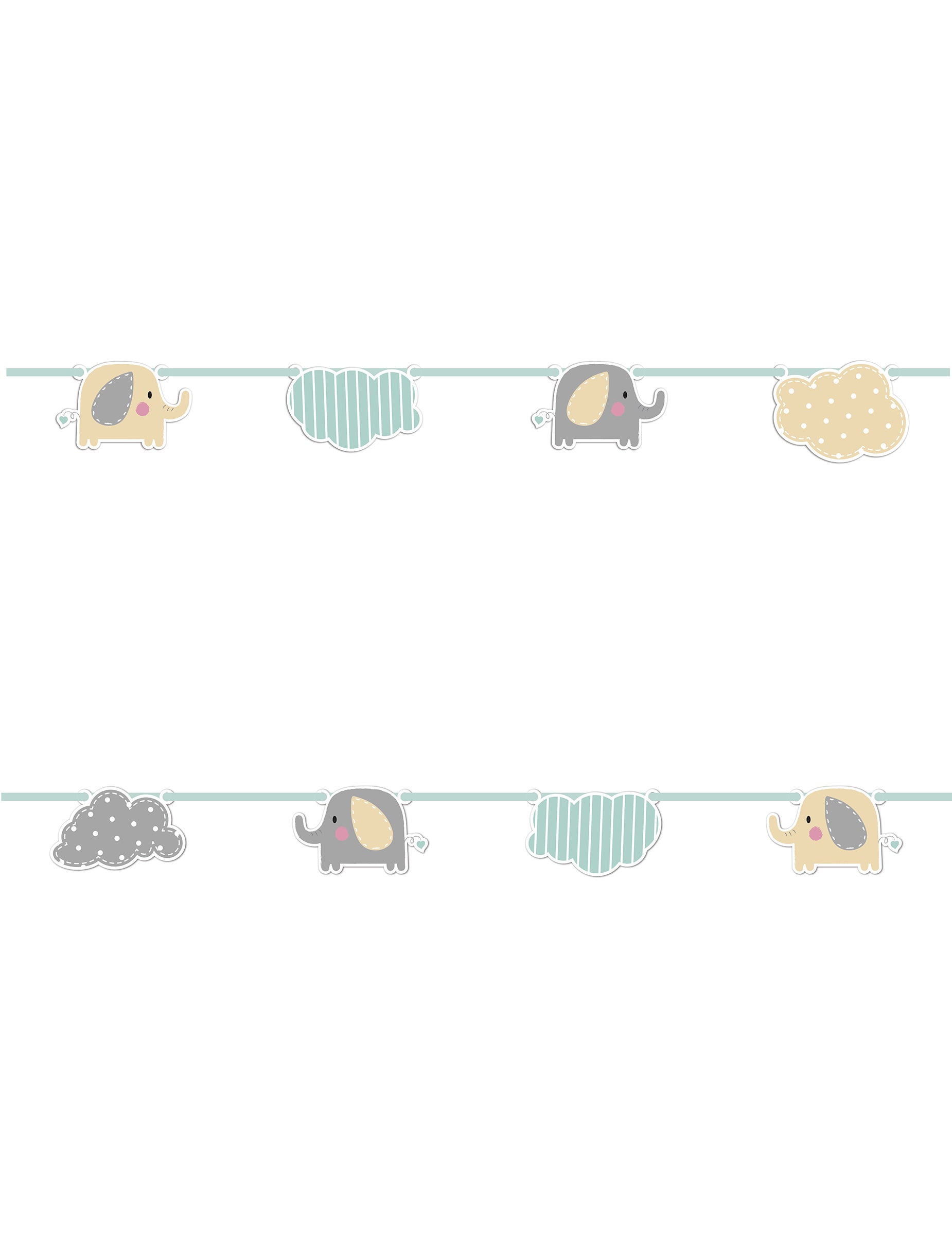 Descoperă această magnifică ghirlandă compus din fanioane din carton care ilustrează personaje drăguțe elefanți însoțite de nori în culori de mentă, gri și fildeș.
