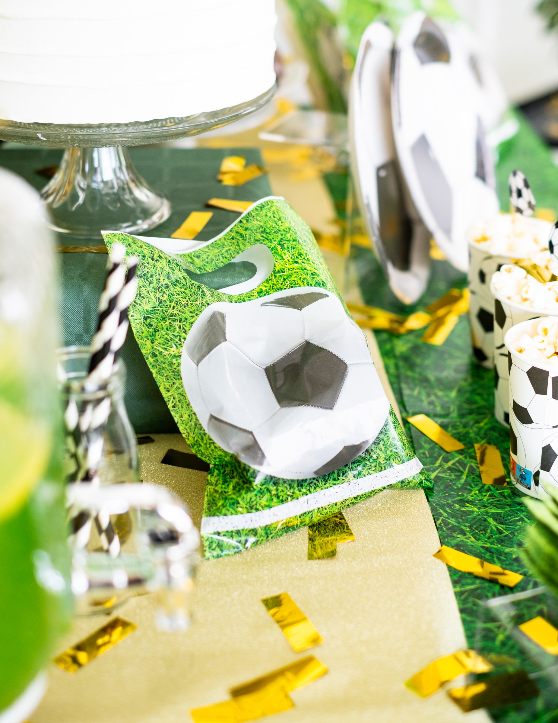 Acest set conține 6 pungi de petrecere tematic. Fiecare buzunar măsoară aproximativ 23 x 16 cm și afișează o imagine dinamică fotbal pe terenul unui stadion. Acestea pungi de cadou sunt perfecte pentru a oferi dulciuri sau surprize micilor oaspeți la o petrecere ziua de naștere a fotbalului de succes.